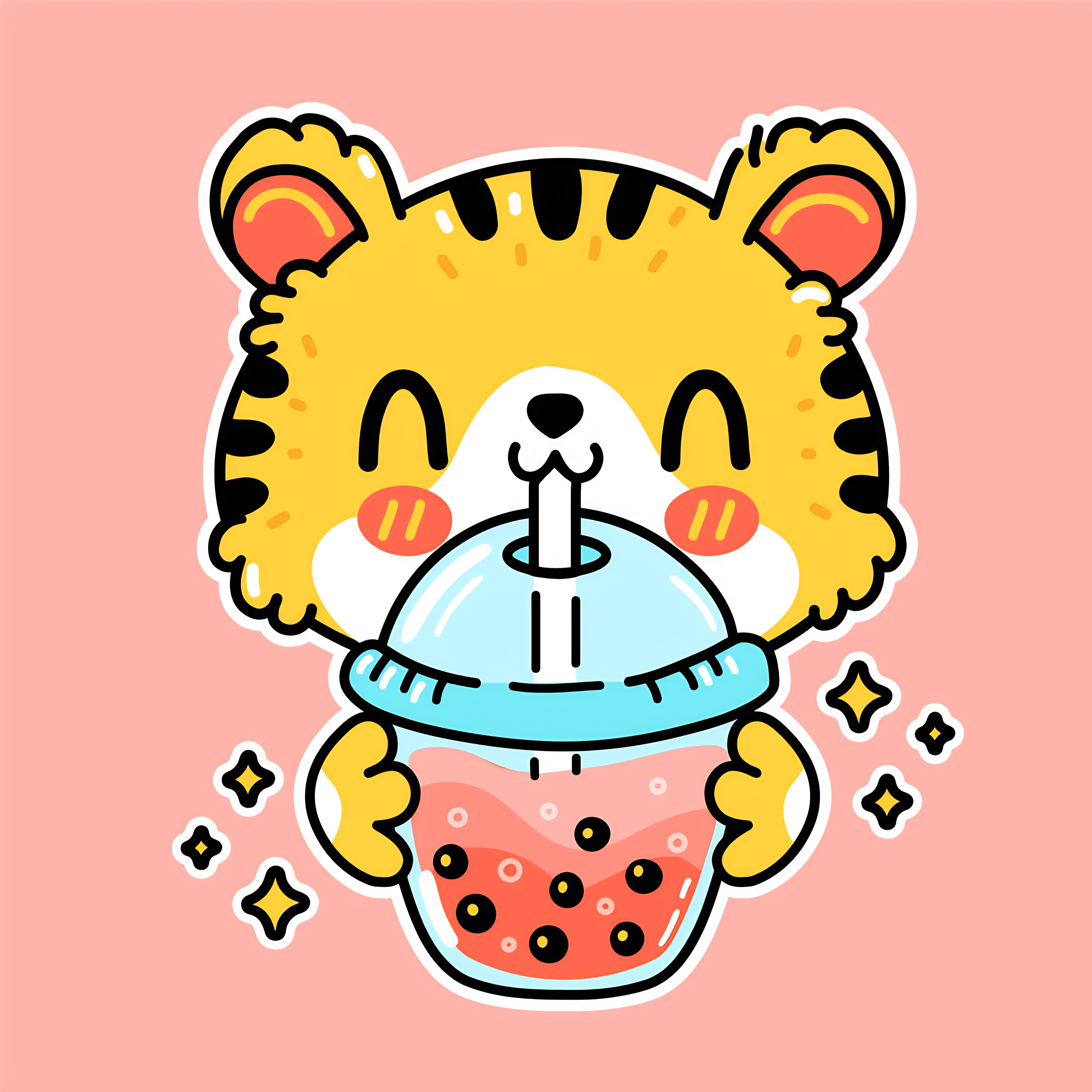 Cute funny tiger drink bubble tea from cup. Vector hand drawn cartoon kawaii character illustration sticker logo icon. Asian boba, bubble tea drink cartoon character poster concept