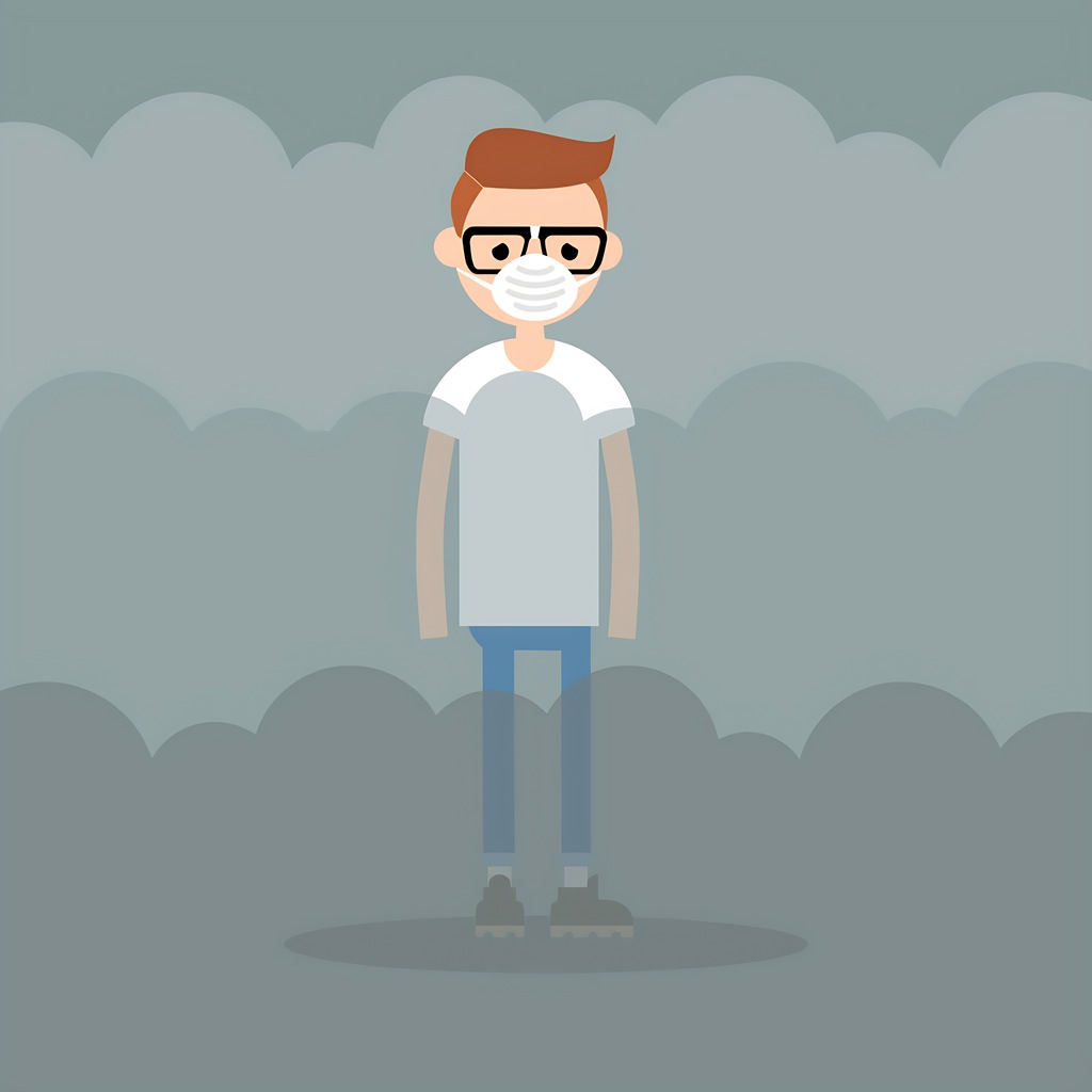 Air pollution. Smog. Young character wearing a protective face m
