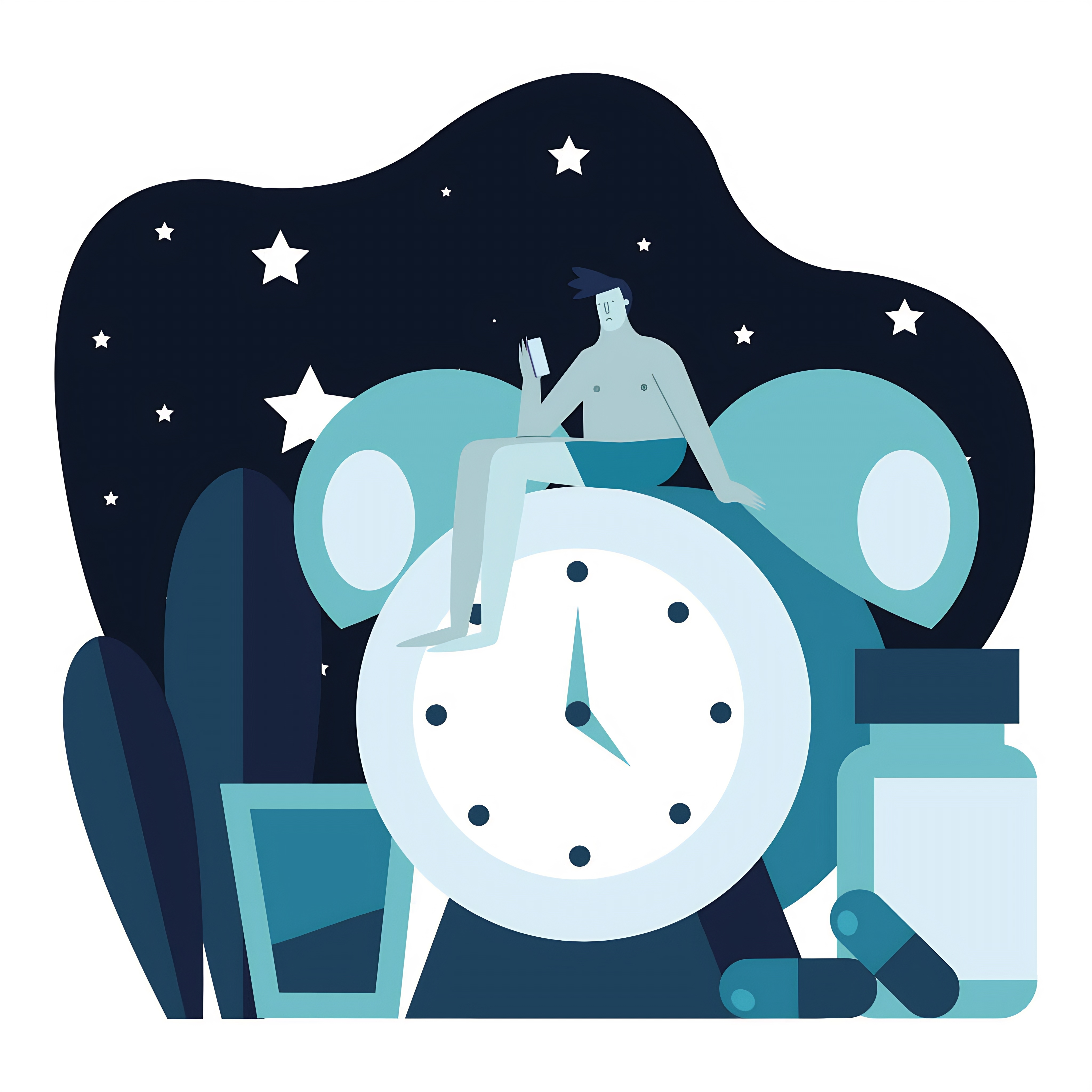 man seated in alarm clock suffering from insomnia character