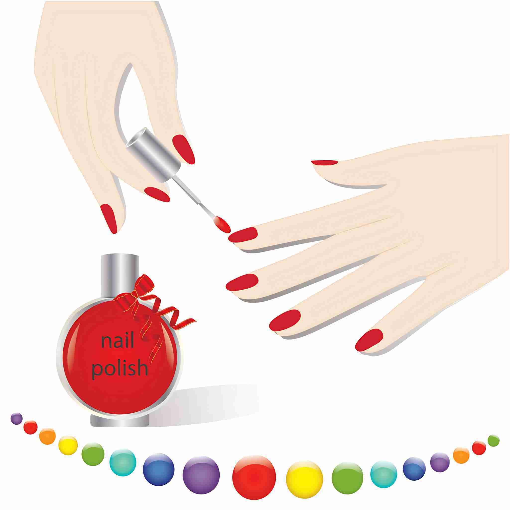 set of feminine hands manicure red nail polish in a glass bottle decorated with ribbon palette of co