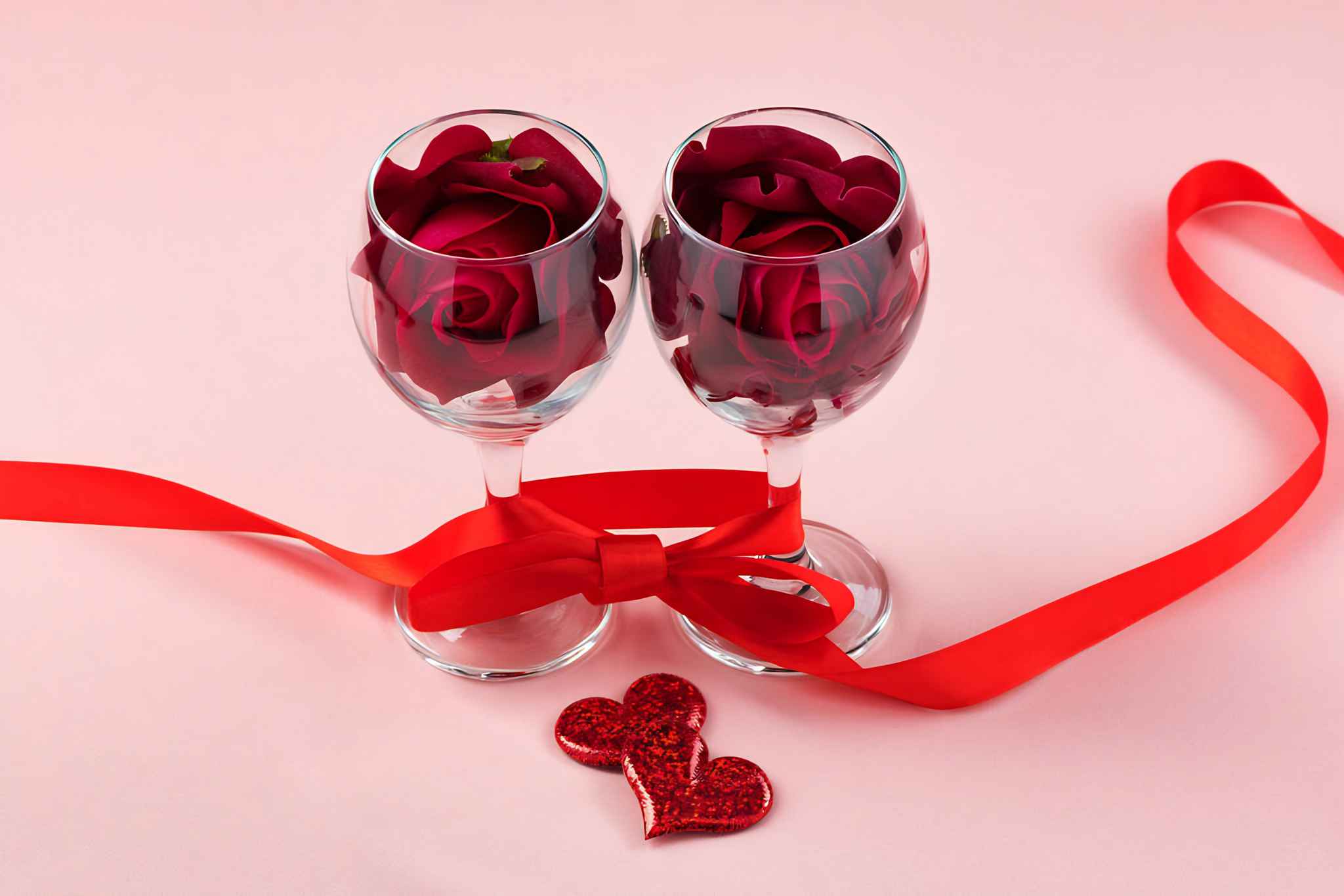 Two glasses of wine, rose and heart on a pink background. Valentines day card.