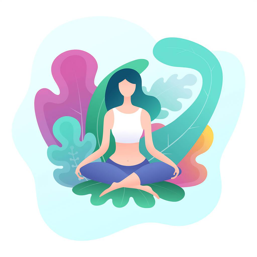 Young woman sitting in a lotus position surrounded by leaves. Meditation and relaxation poster. Colorful vector illustration.