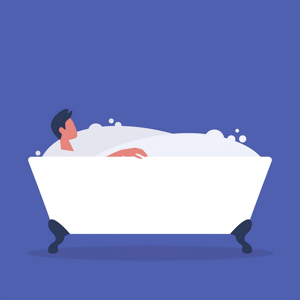 Young male character washing in a bathtub full of soap foam, rel