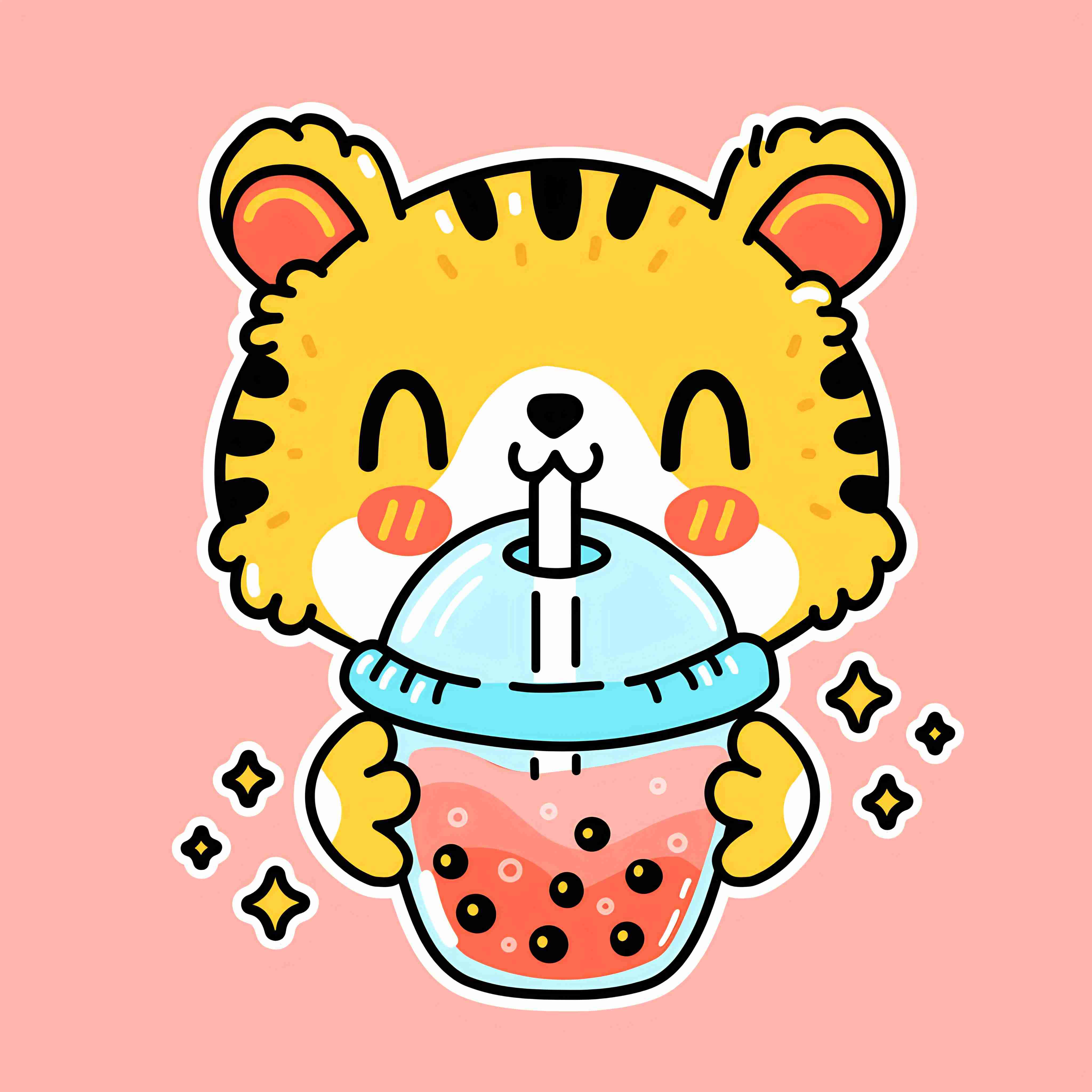 Cute funny tiger drink bubble tea from cup. Vector hand drawn cartoon kawaii character illustration sticker logo icon. Asian boba, bubble tea drink cartoon character poster concept