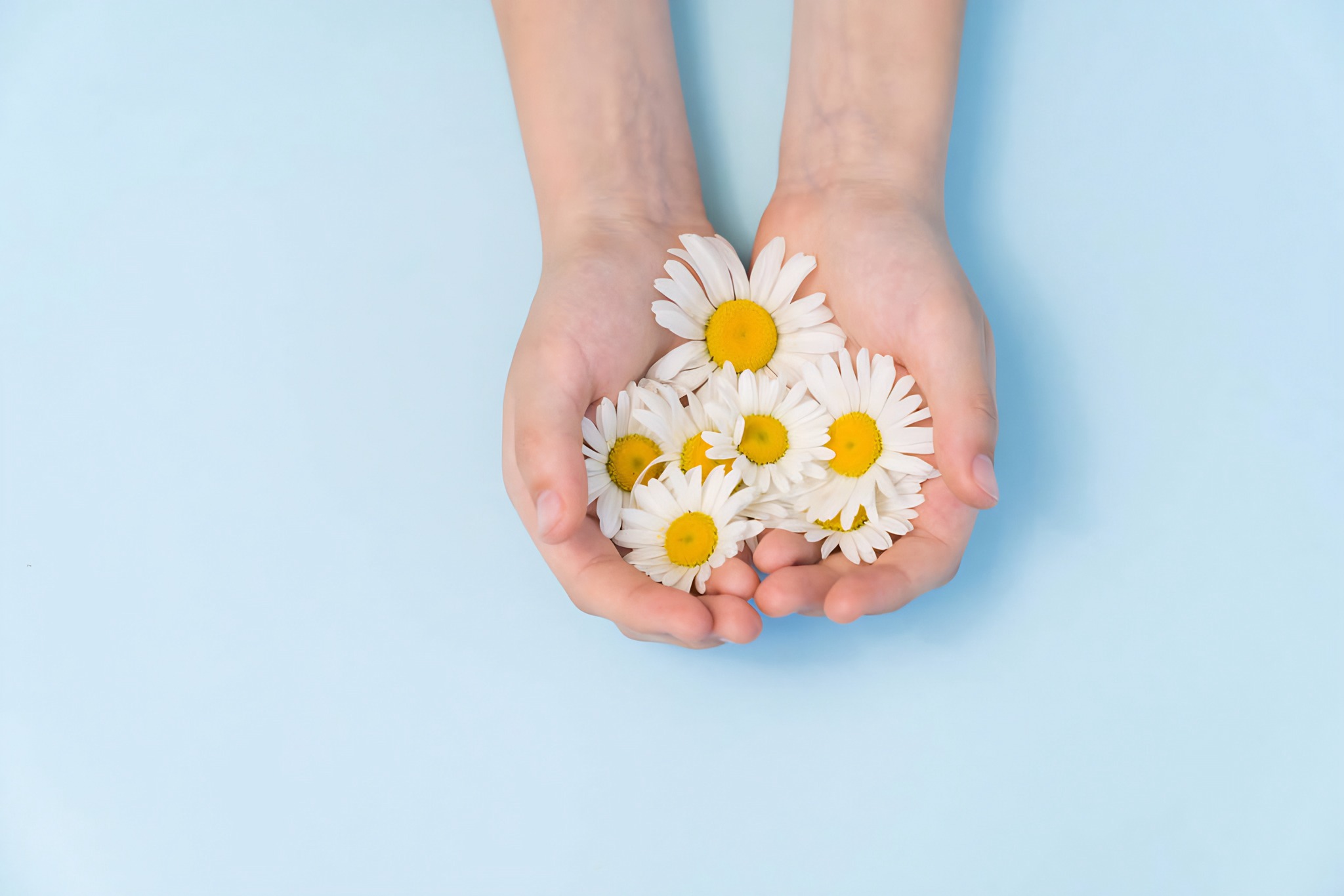chamomile in kid hands on blue background. concept of natural cosmetics.