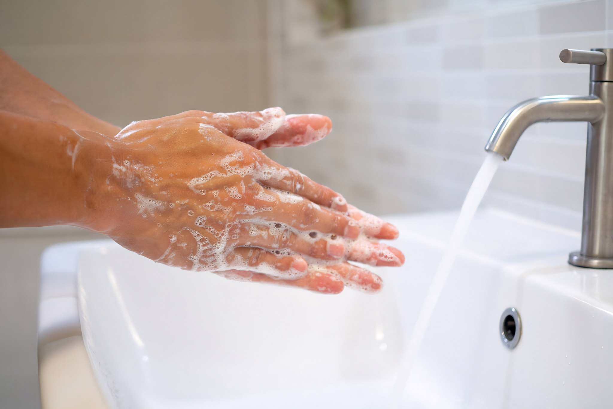 Women using gel to wash hands and turn on water to wash is the treatment and prevention of infection