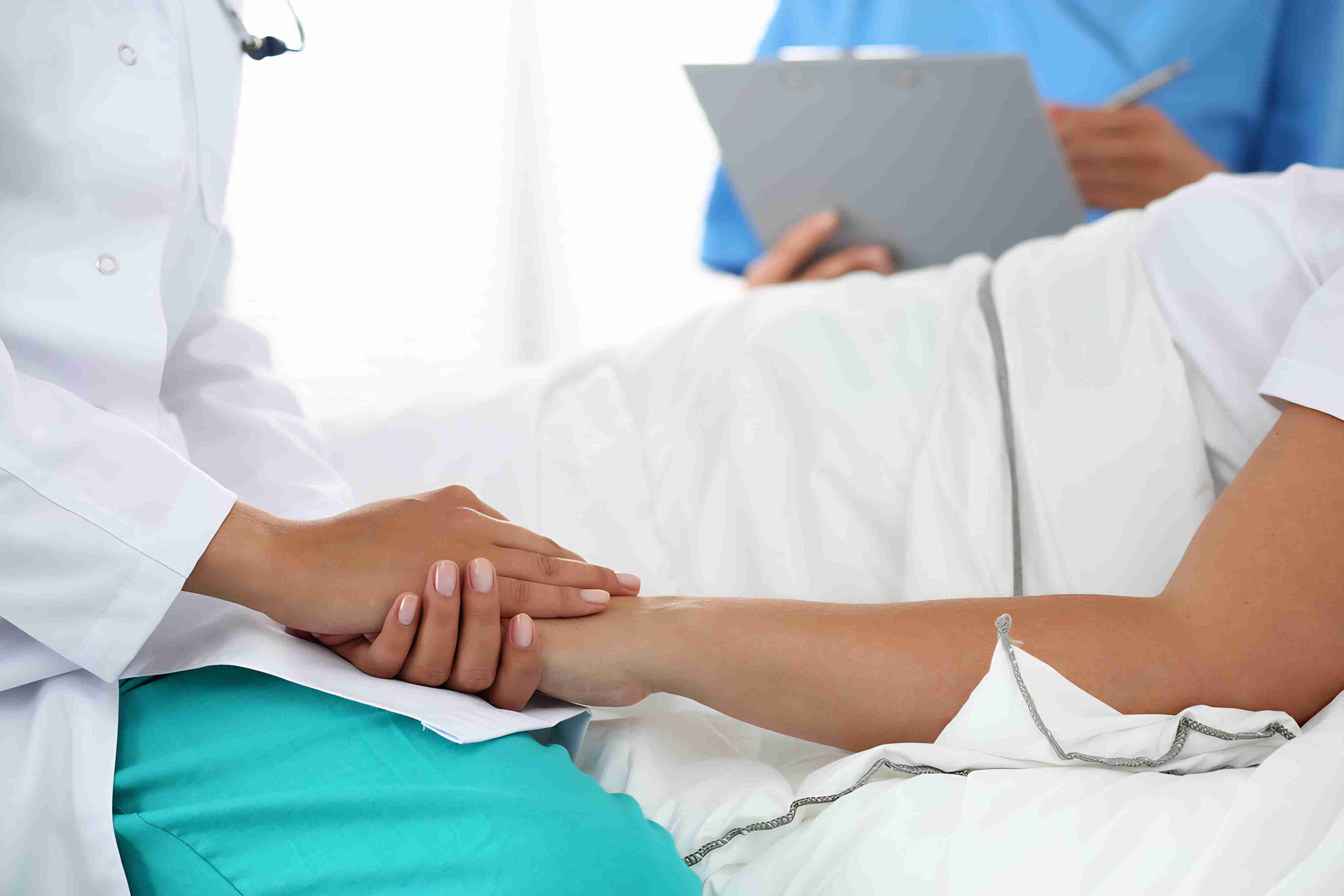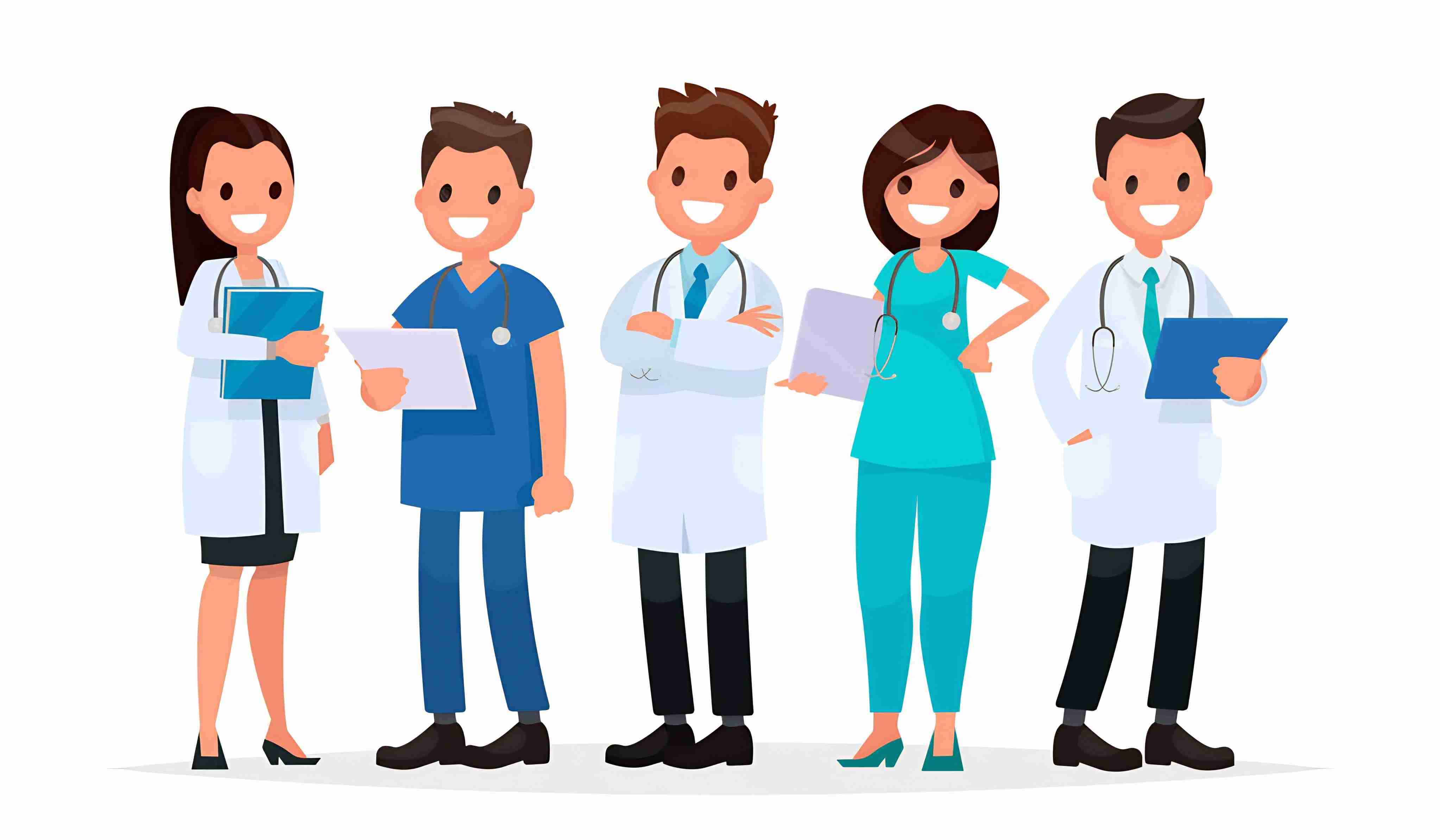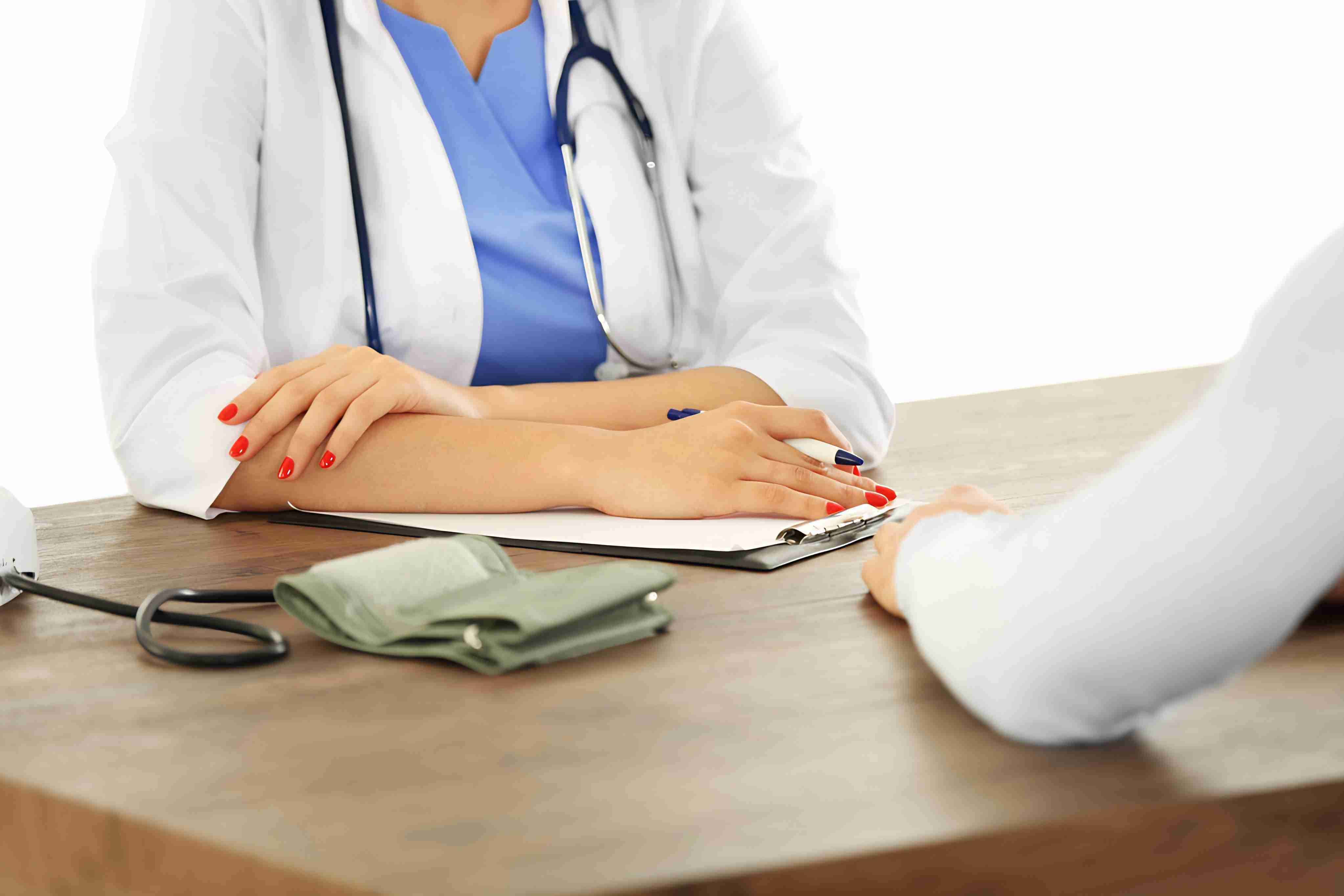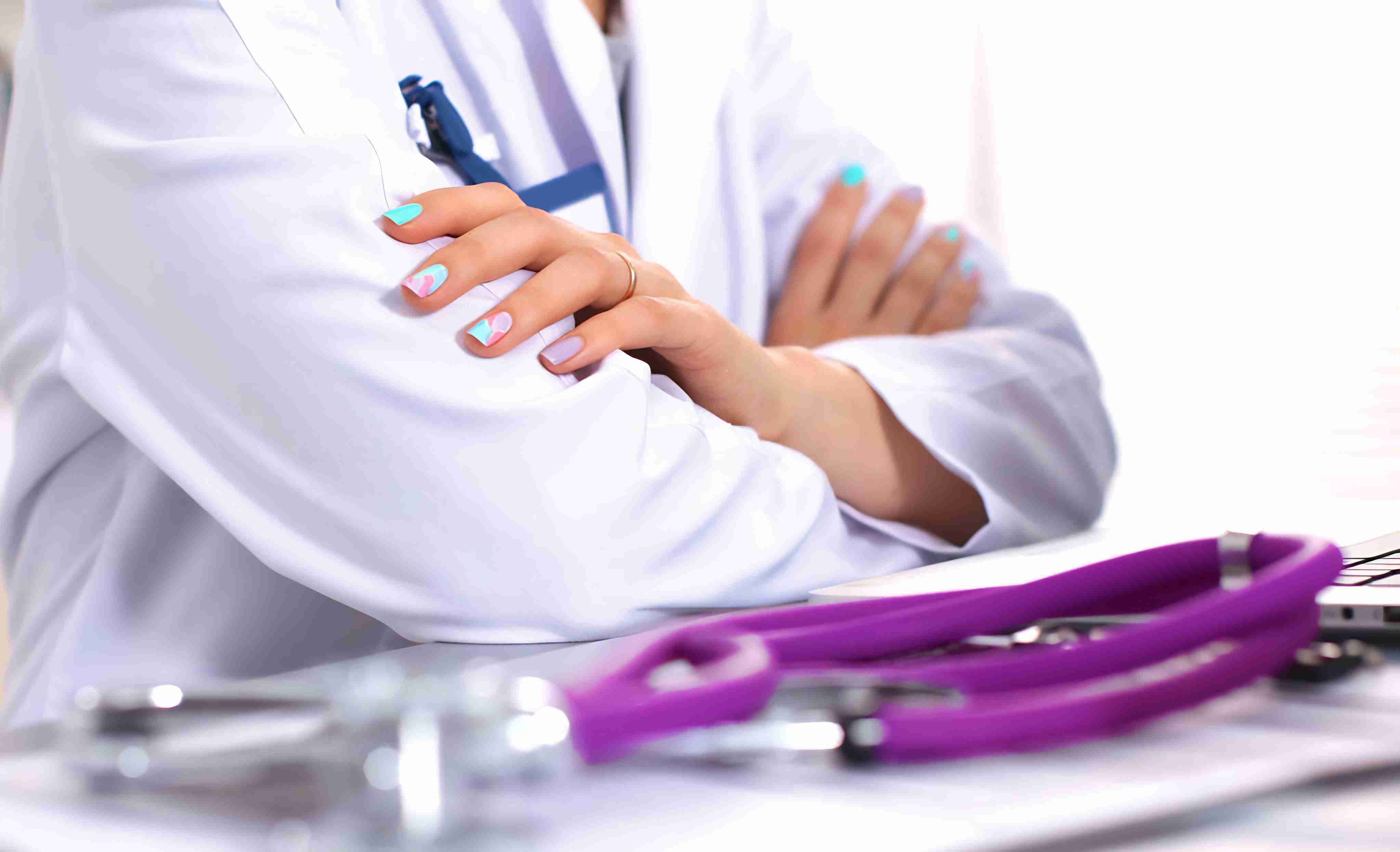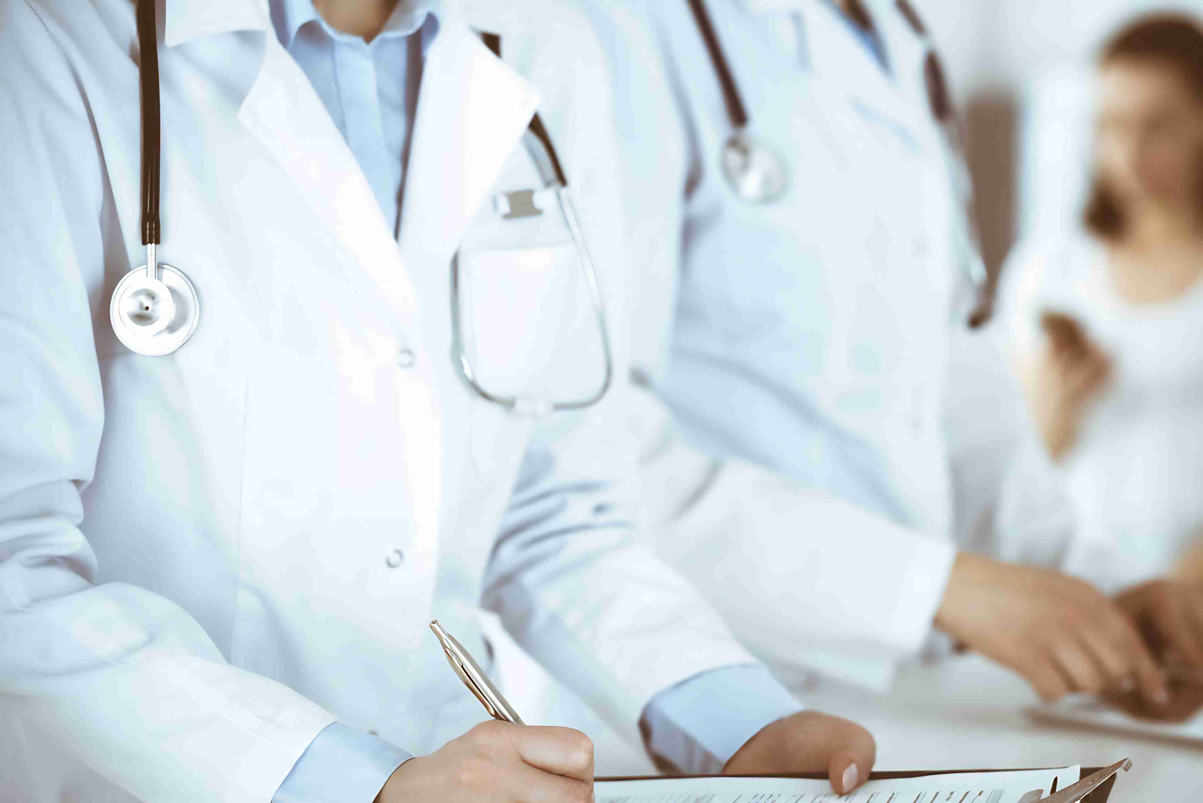 Unknown woman-doctors at work with patient at the background. Female physicians filling up medical documents or prescription while standing in hospital reception desk, close-up. Health care concept