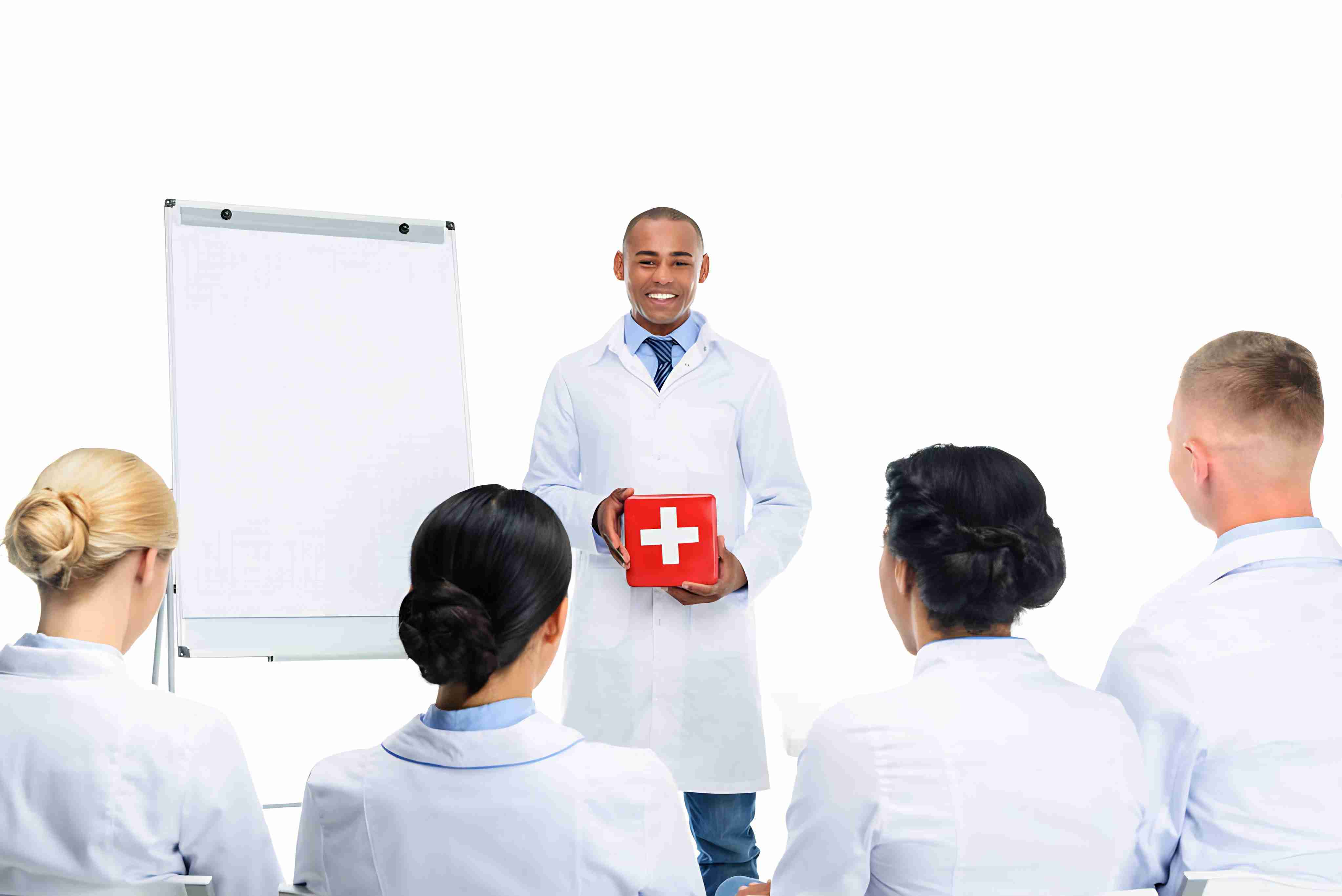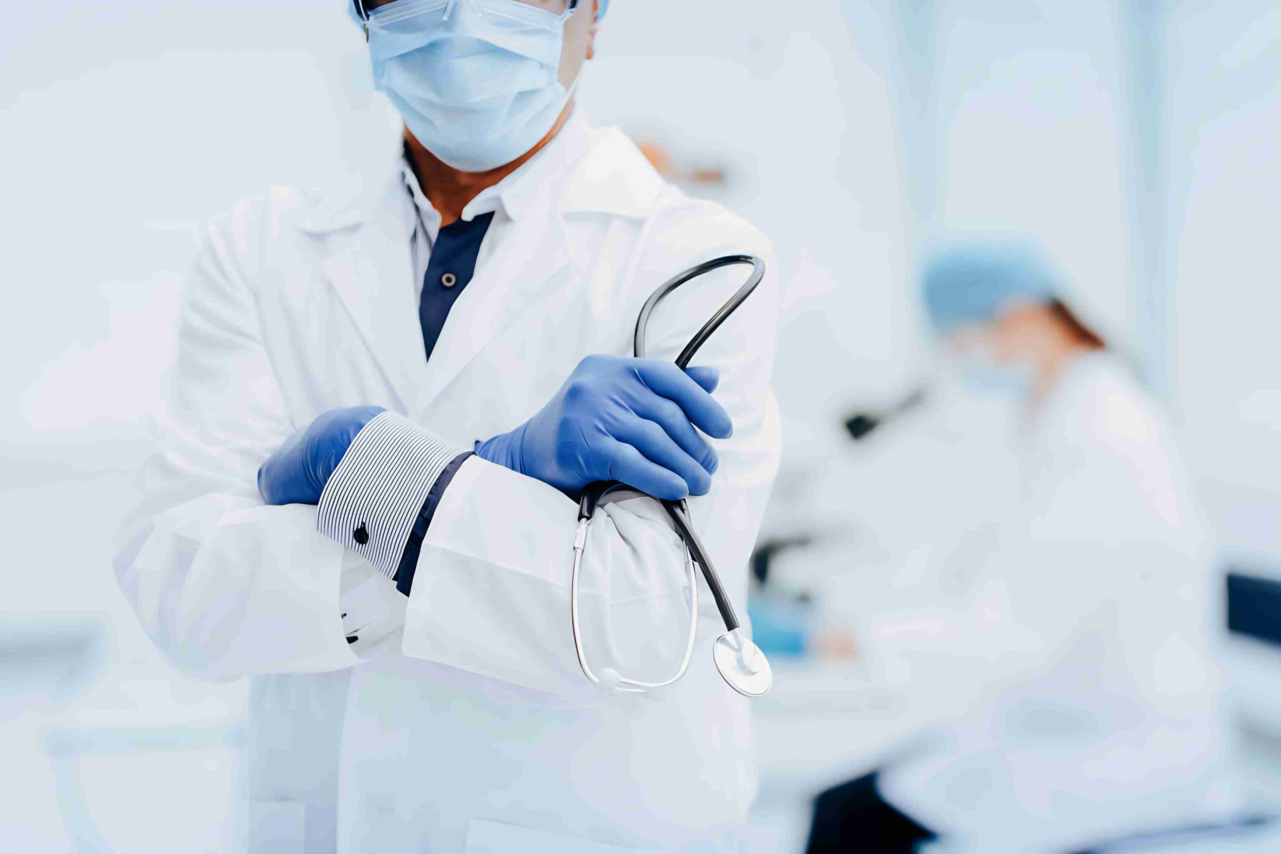 practicing doctor with a stethoscope in his hands on the background of the laboratory.