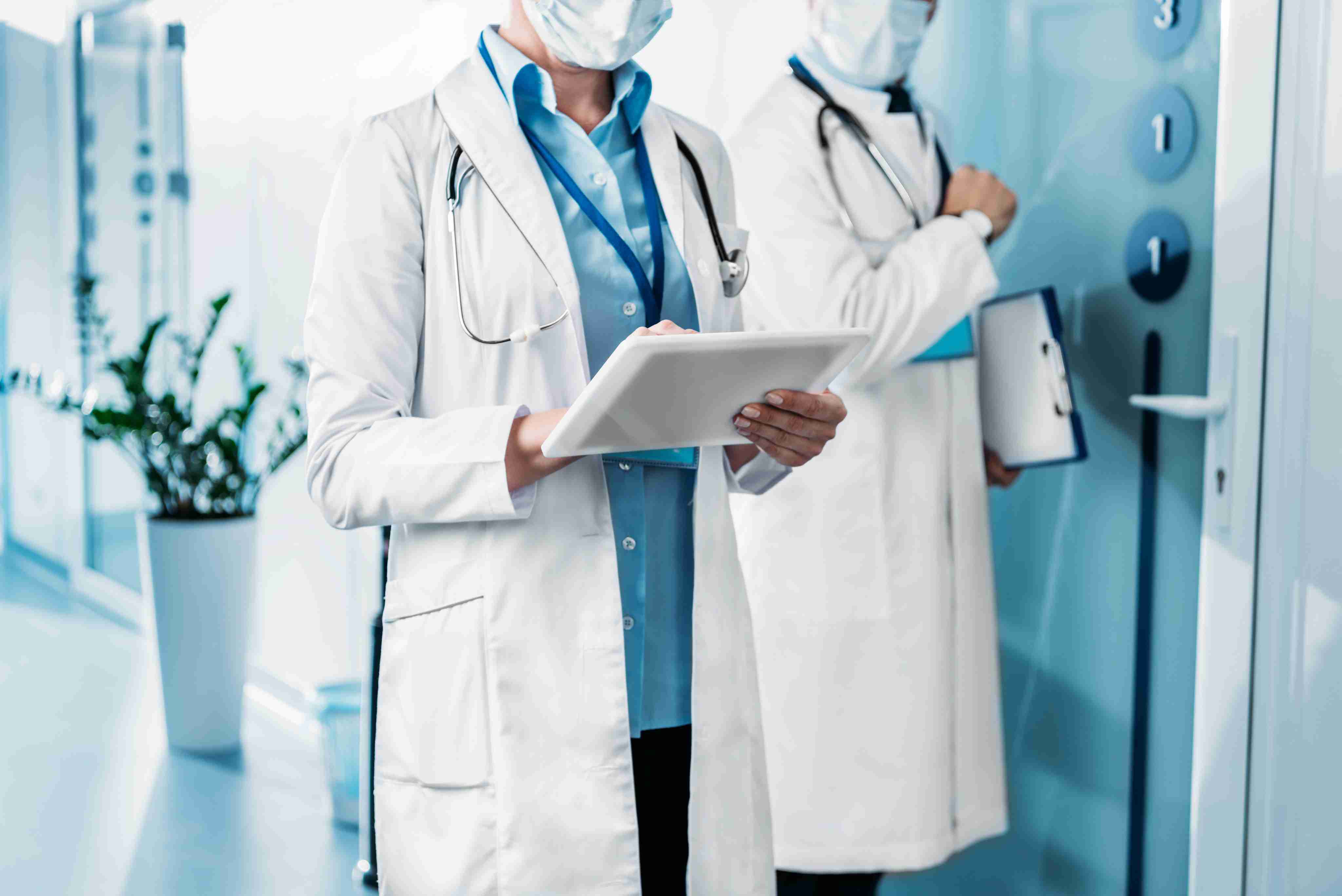 partial view of female doctor in medical mask using digital tablet while her male colleague standing behind with clipboard in hospital corridor