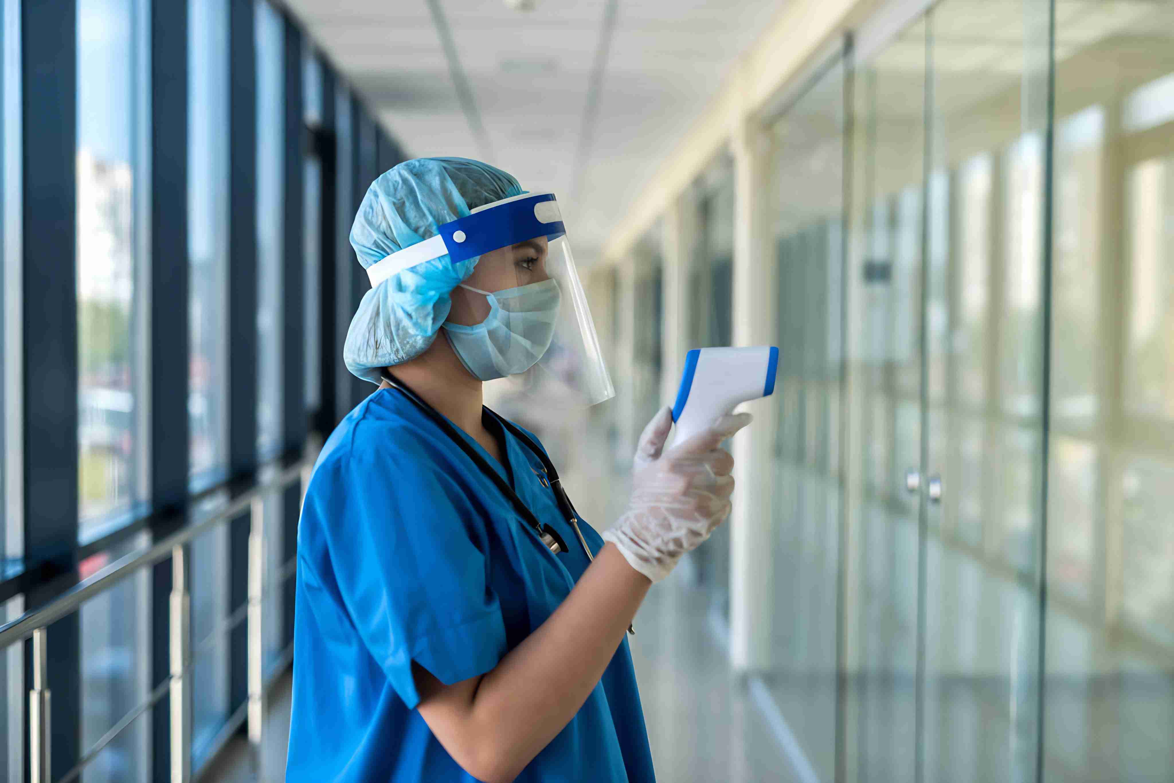 Female doctor wearing protective mask and face shield using infrared thermometer to check body temperature in clinic. covid19