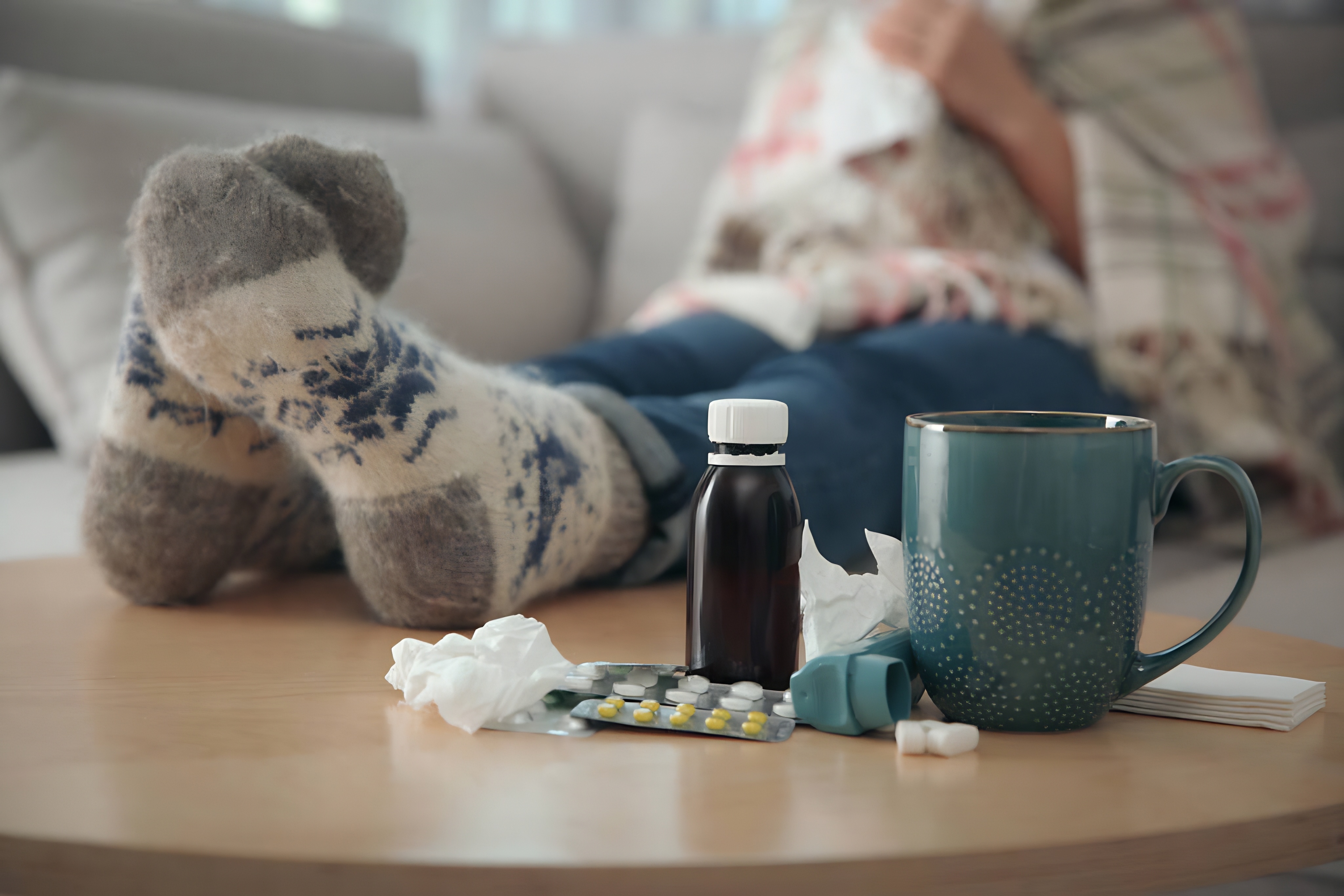 穿着温暖袜子的人靠近桌子,在室内有不同的补救措施,特写。流感病毒
