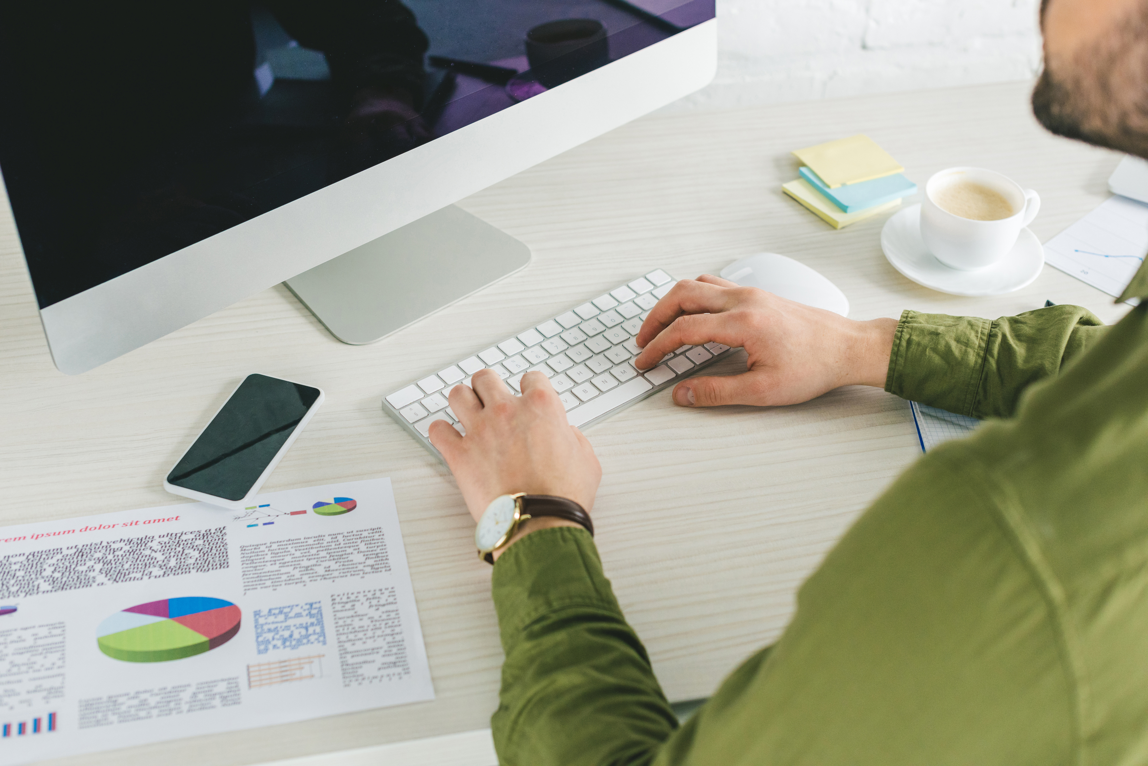 Data science concept with people scene in flat cartoon design. Man works with charts and graphs dash