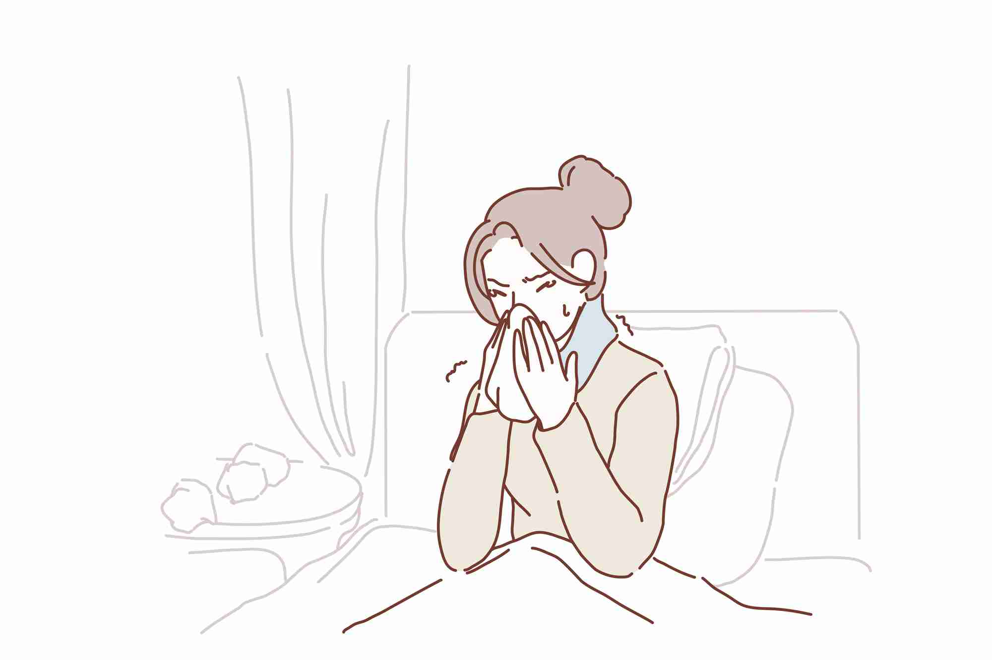 Ill young woman caught cold sneezing in tissue at home , sick allergic girl blowing wiping running n
