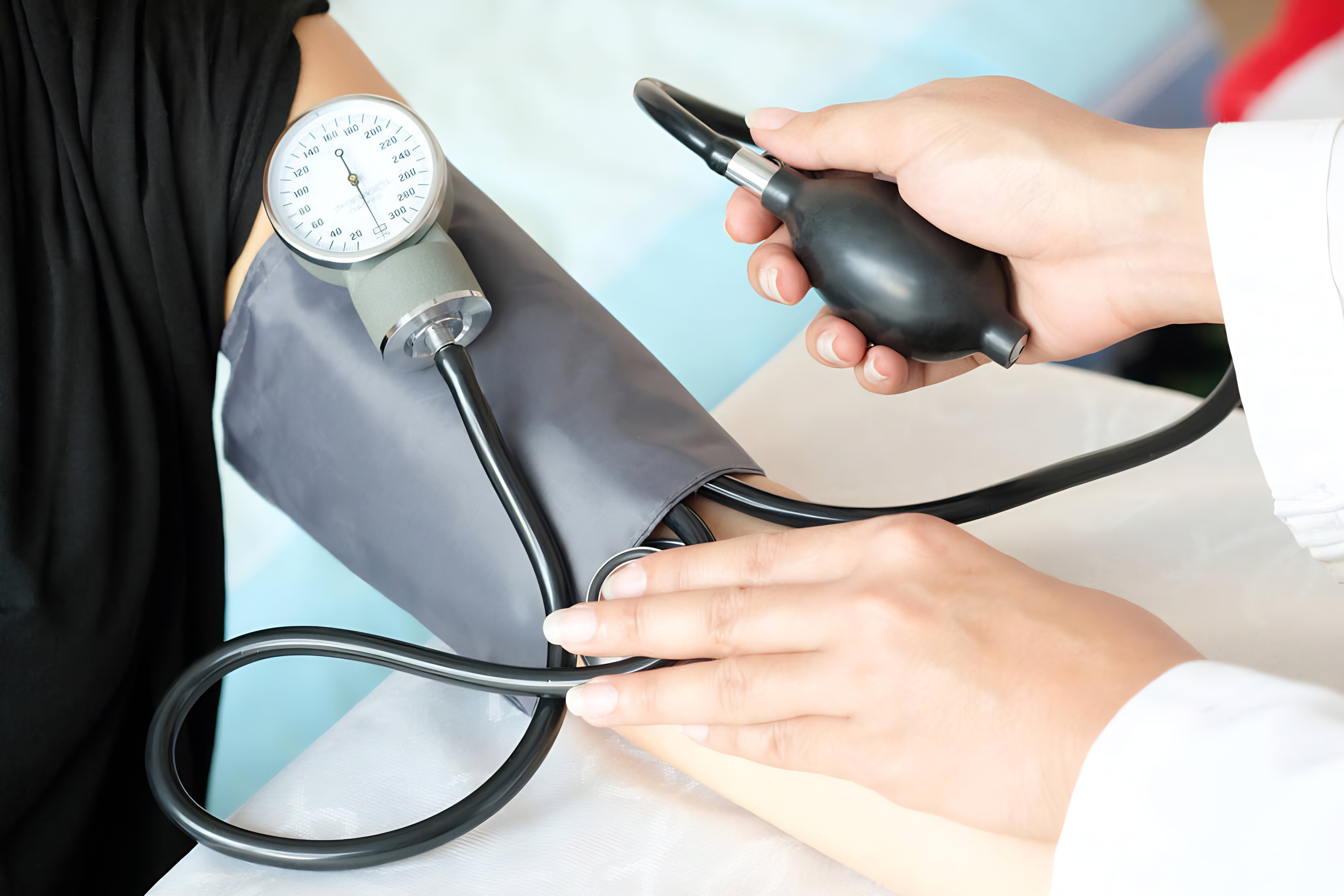 Doctor hands examining patient with aneroid sphygmomanometer