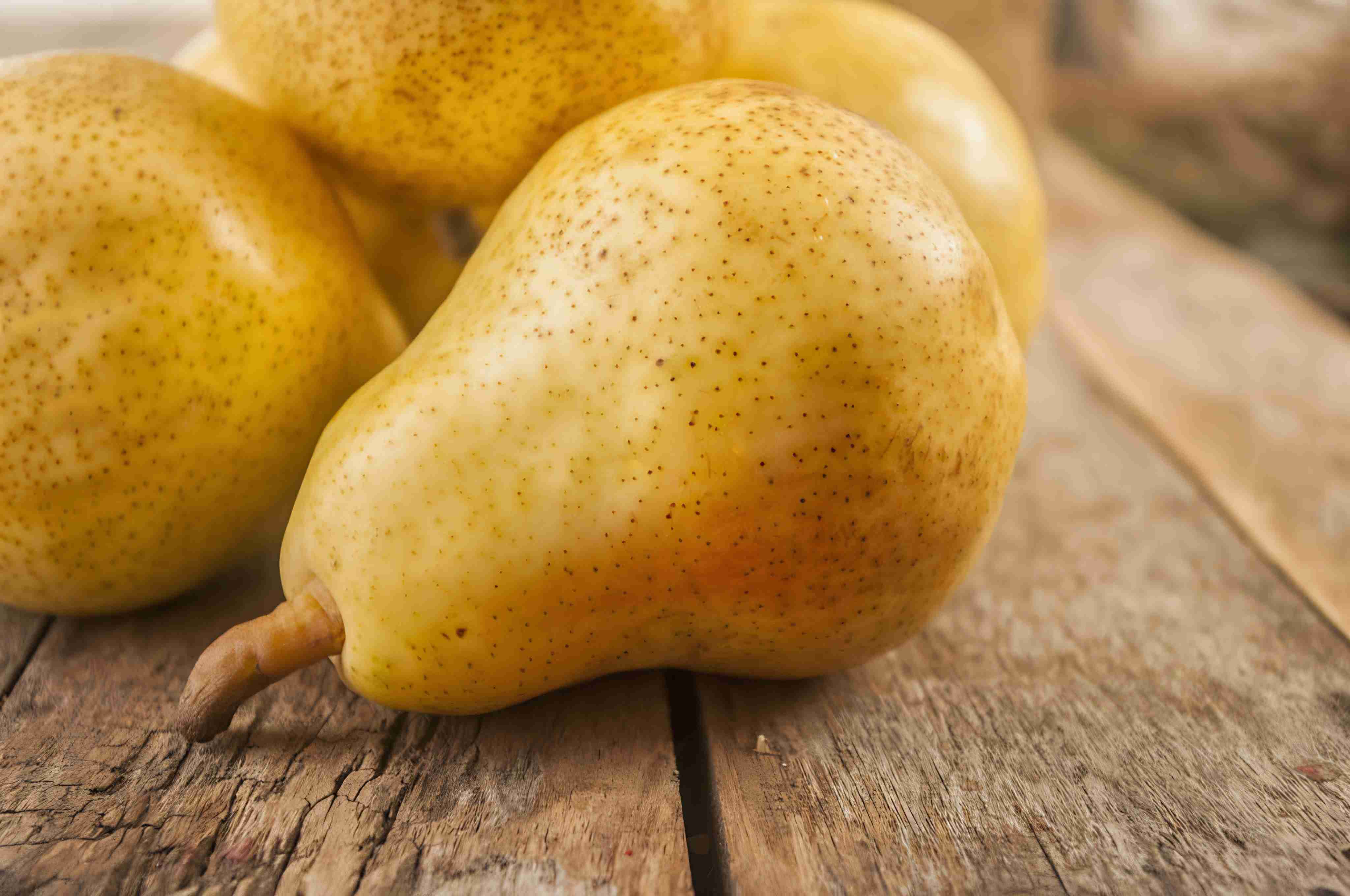 Delicious Williams or Bartlett pears on a rustic wooden kitchen table
