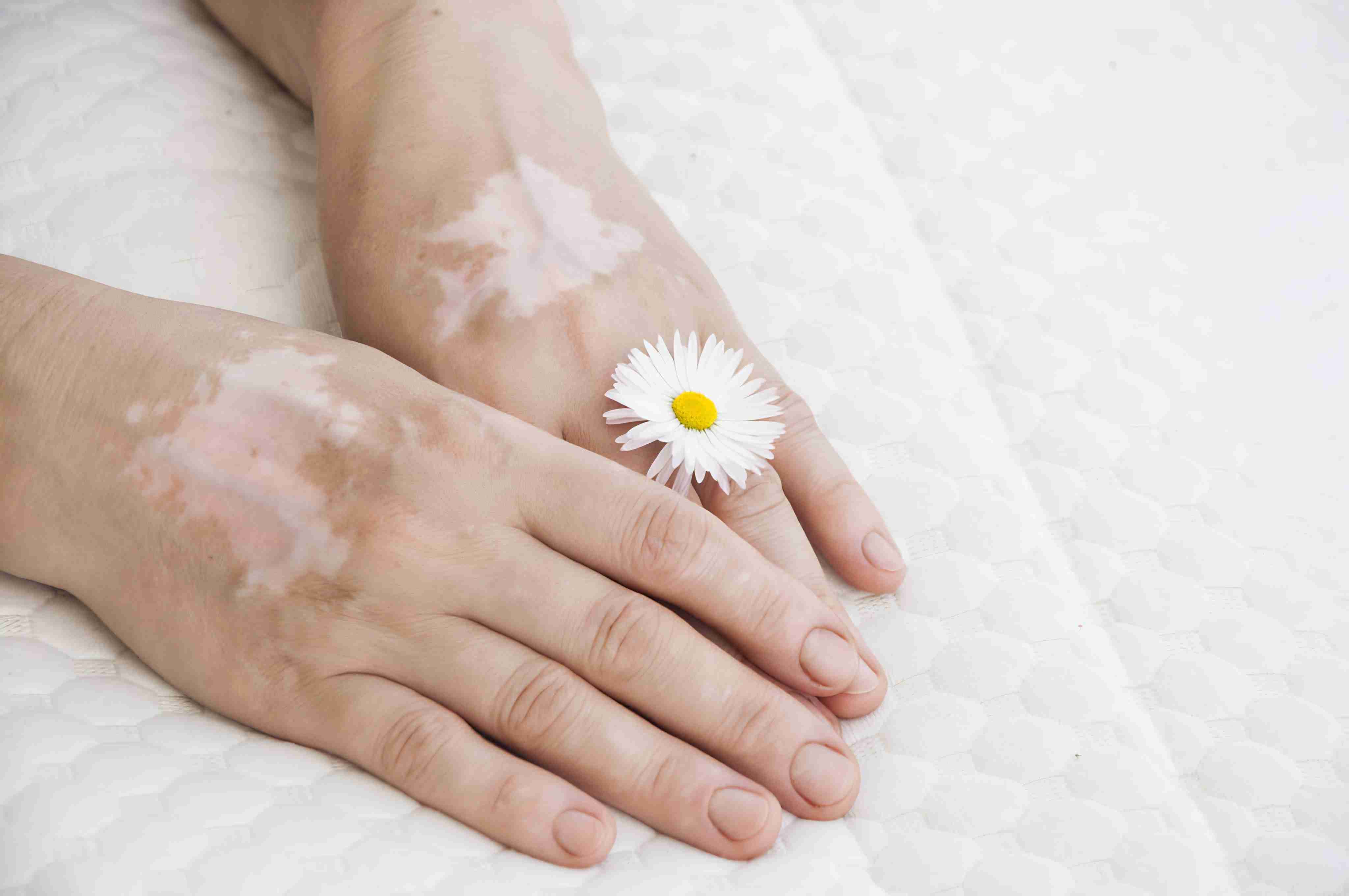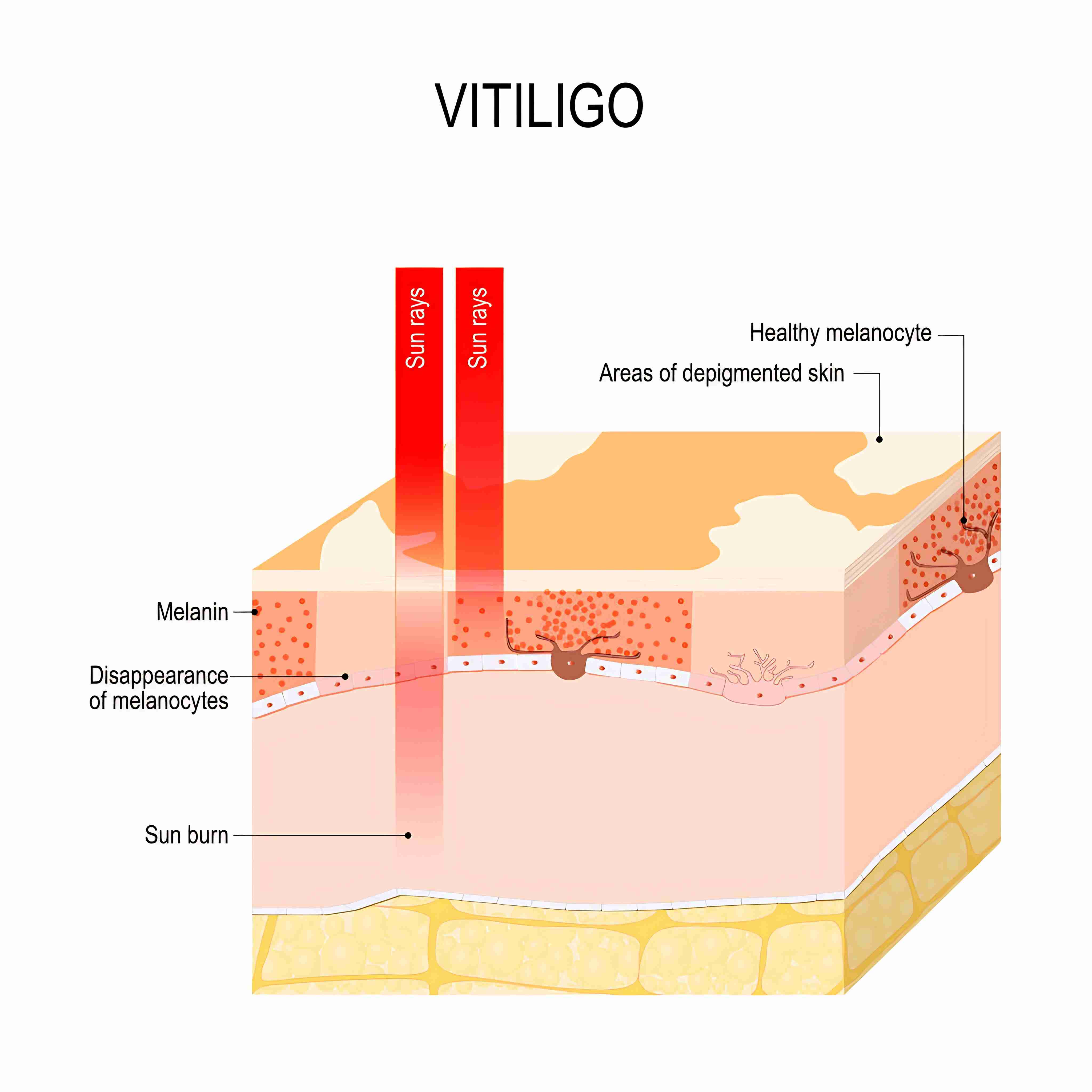 Vitiligo. Is a skin condition characterized by portions of the skin losing their pigment. It occurs when skin pigment cells (melanocytes) die or are unable to function. Vector diagram for educational, medical, biological and science use
