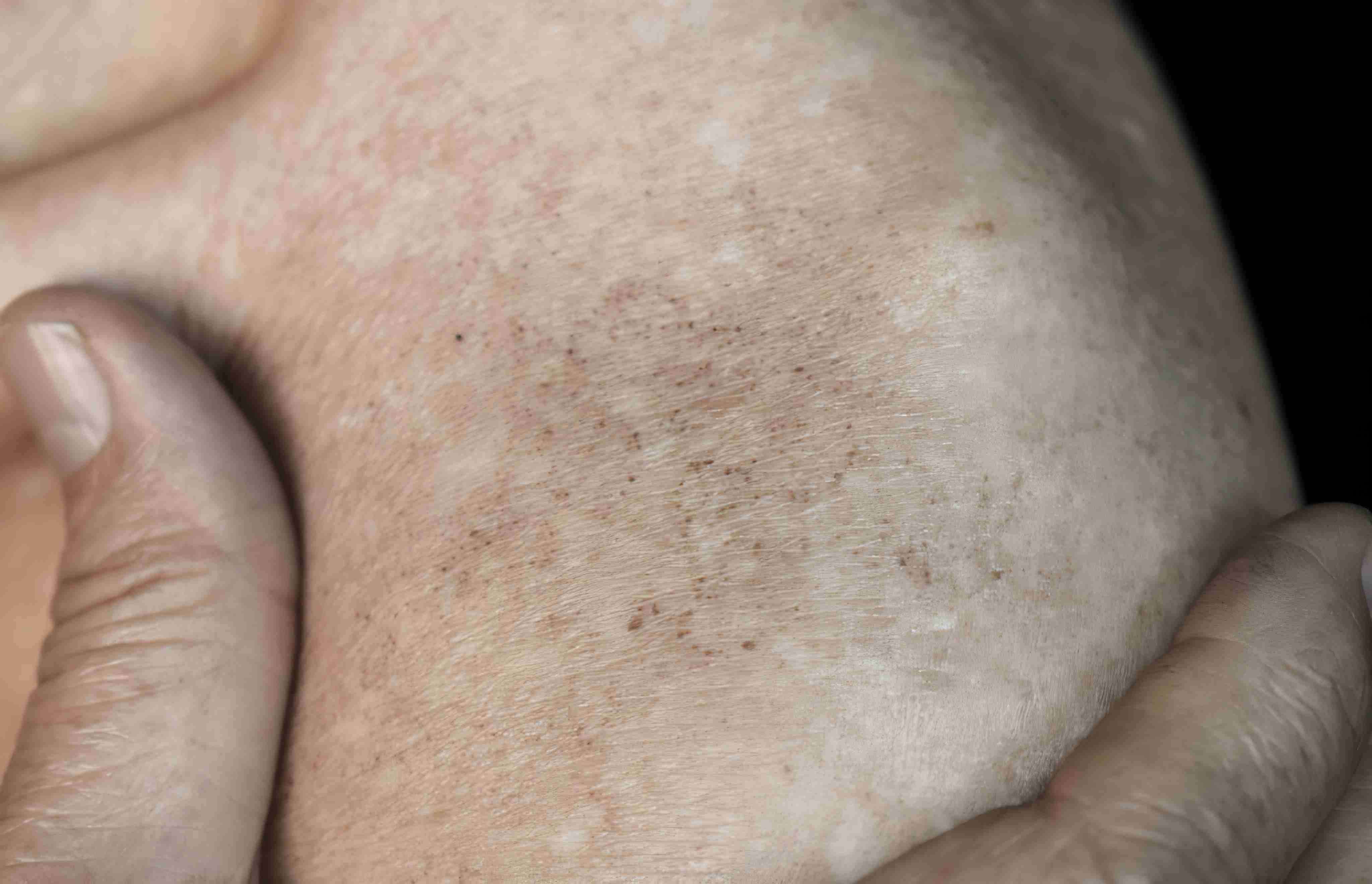 Age spots on body of Asian elder man. They are brown, gray, or black spots and also called liver spots, senile lentigo, solar lentigines, or sun spots.
