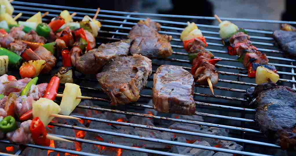 Asian group of friends having outdoor garden barbecue laughing w
