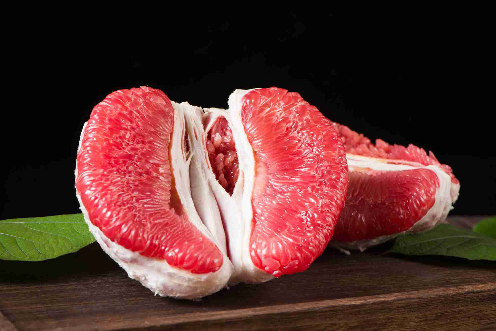 深色木底上的剥开的红心柚子果肉
