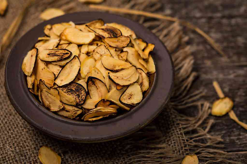 Roasted Garlic Slices on Wooden Background. Selective focus.