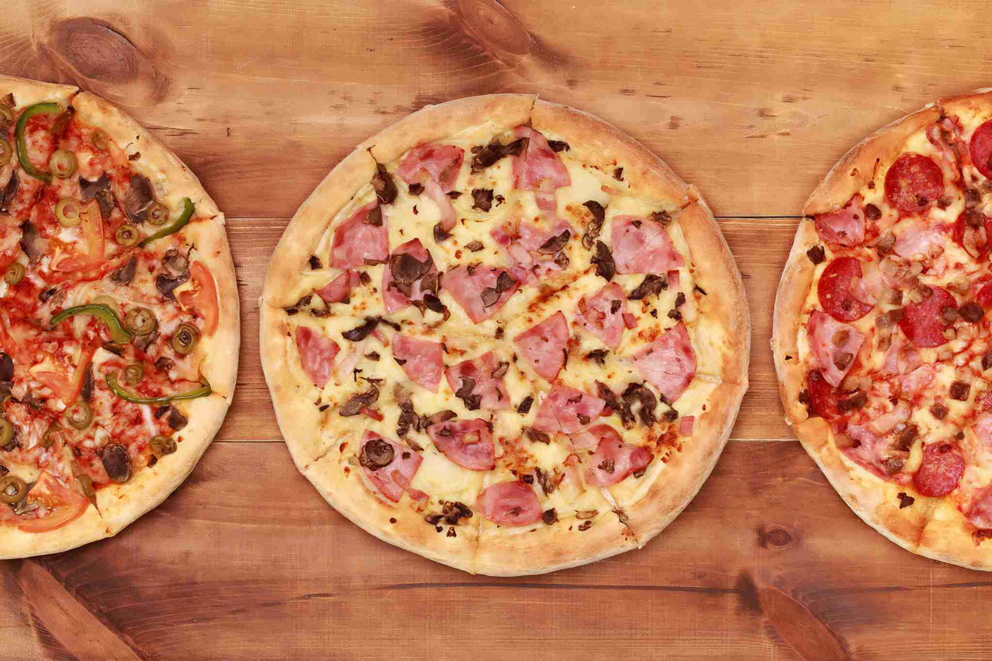 Three tasty pizzas on table