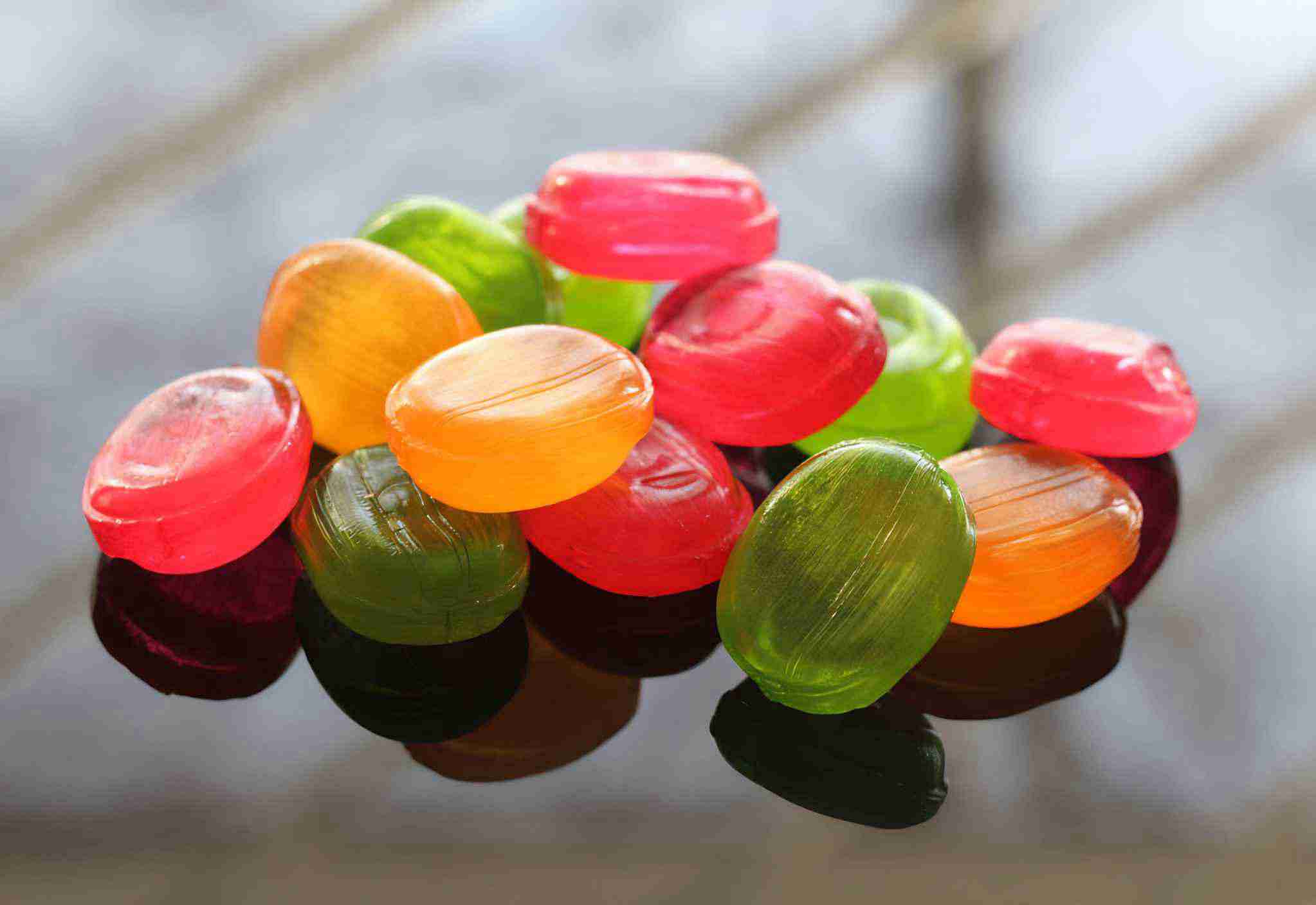 Bright candies caramel scattered on a dark background.