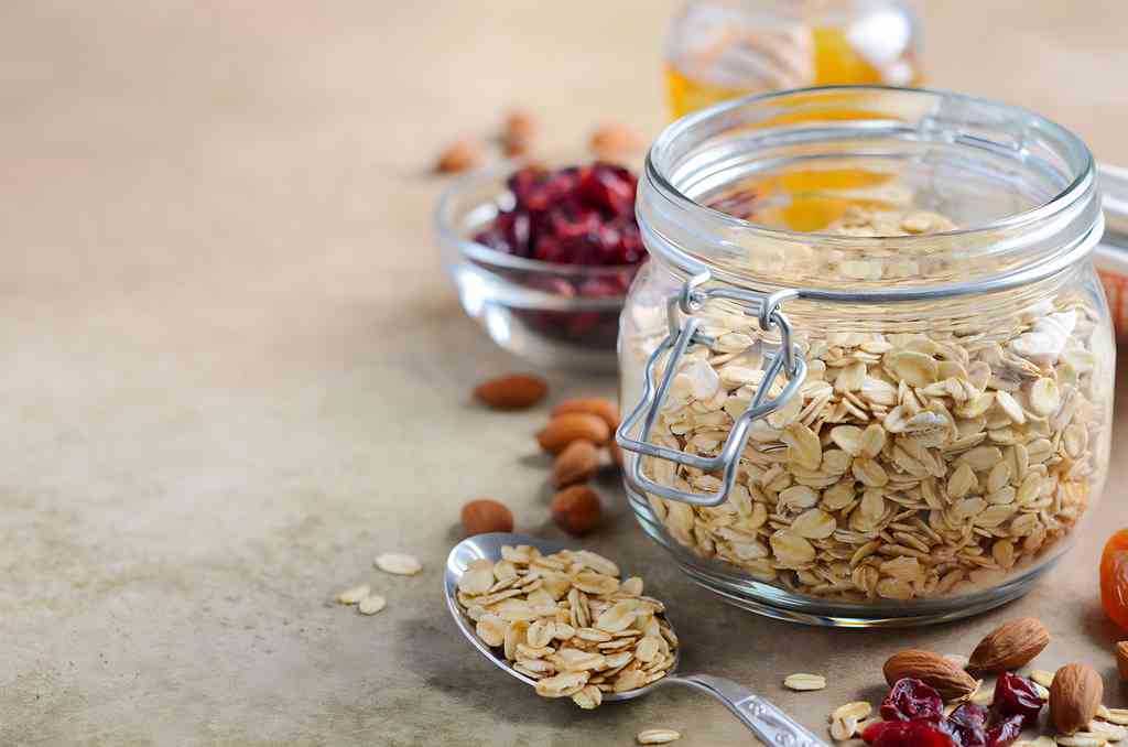 Ingredients for homemade oatmeal granola. Oat flakes, honey, almond nuts, dried cranberries and apricots. Healthy breakfast concept.