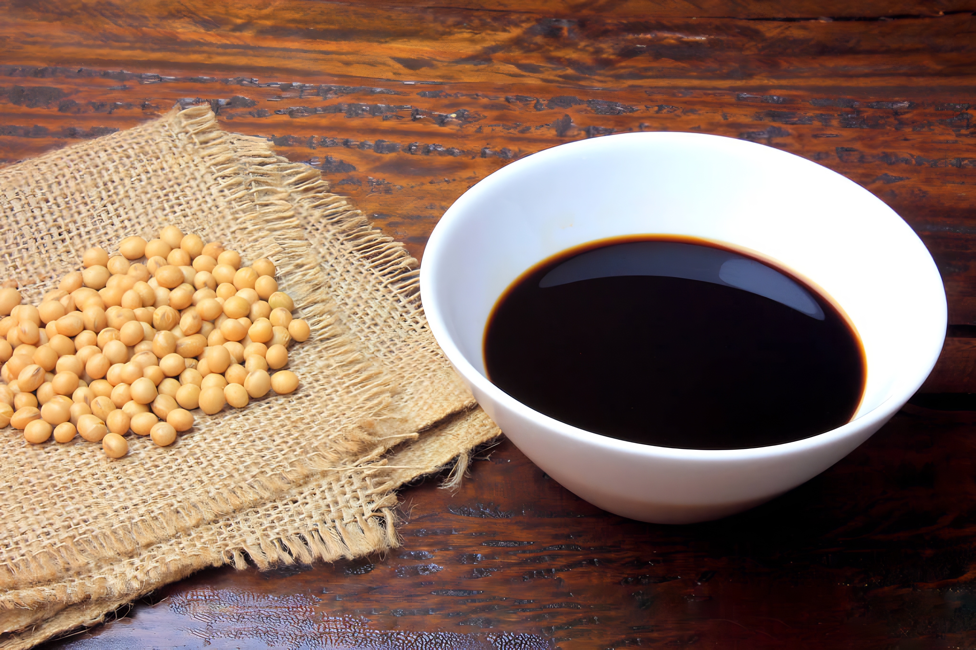 Soy beans with dark soy sauce in a ceramic bowl on rustic wooden table