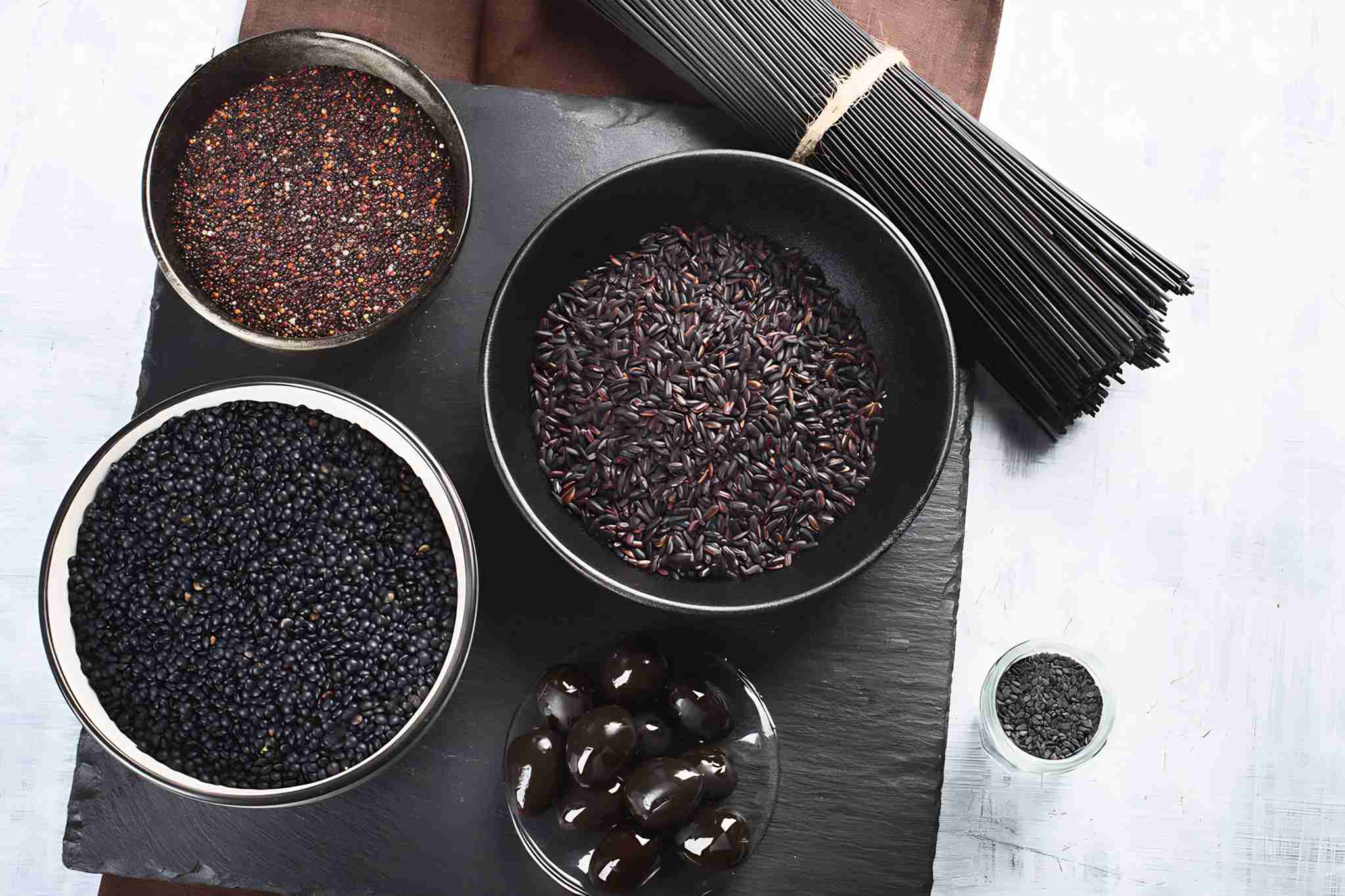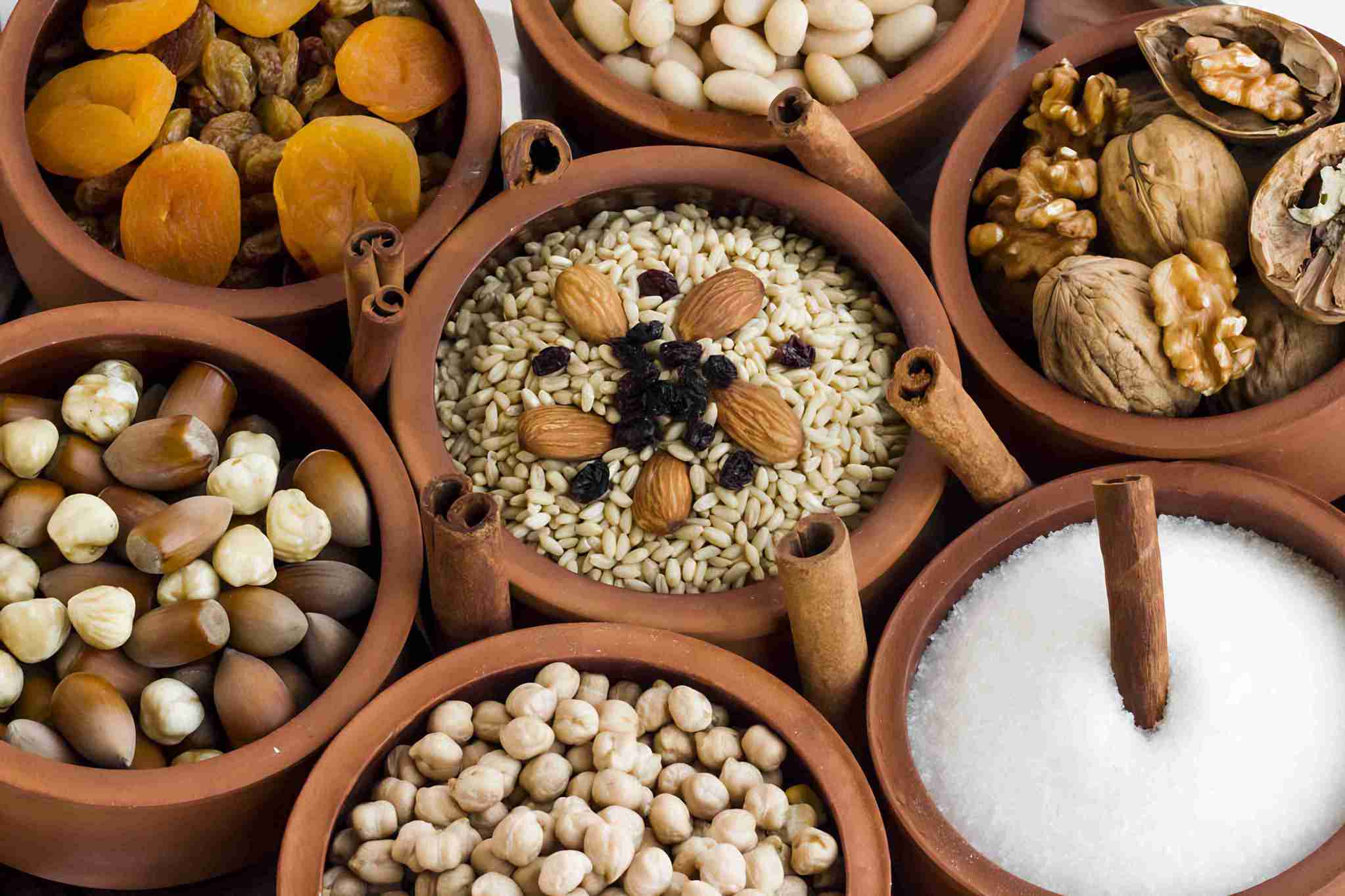 Ingredients Of Traditional Dessert Asure,Noah's Pudding in the casserole bowls on metal tra