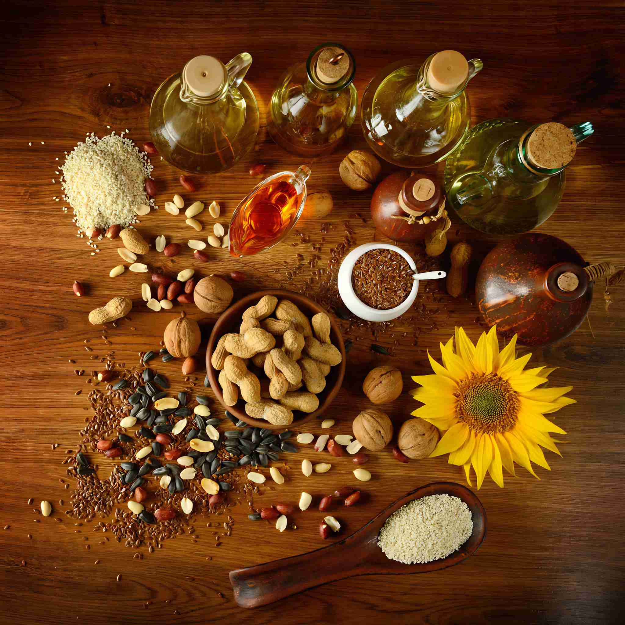 Still life seeds and oils useful for health (Flax, sesame, sunflower, olives, walnut, peanuts). Top