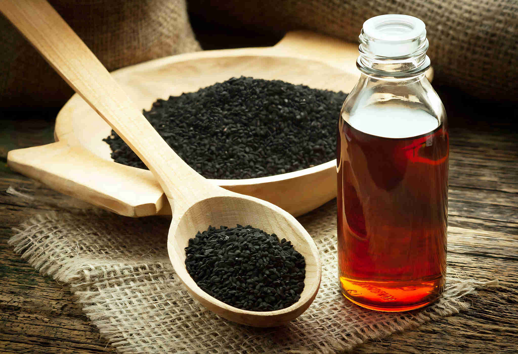 Nigella sativa (Black cumin) on wooden spoon and essential oil. Real oil from nigella looks like dar