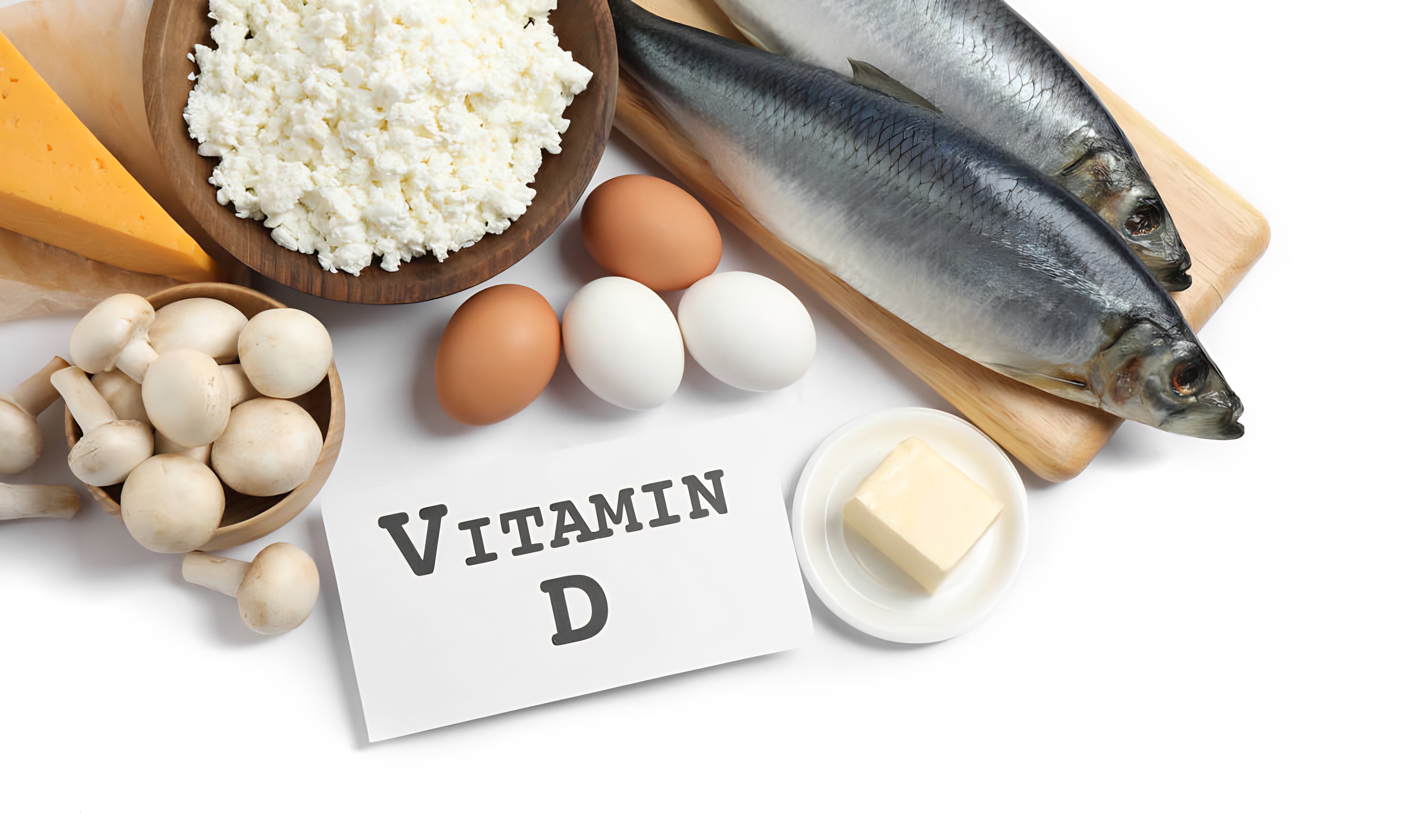 Paper with phrase VITAMIN D and fresh products on white background, top view