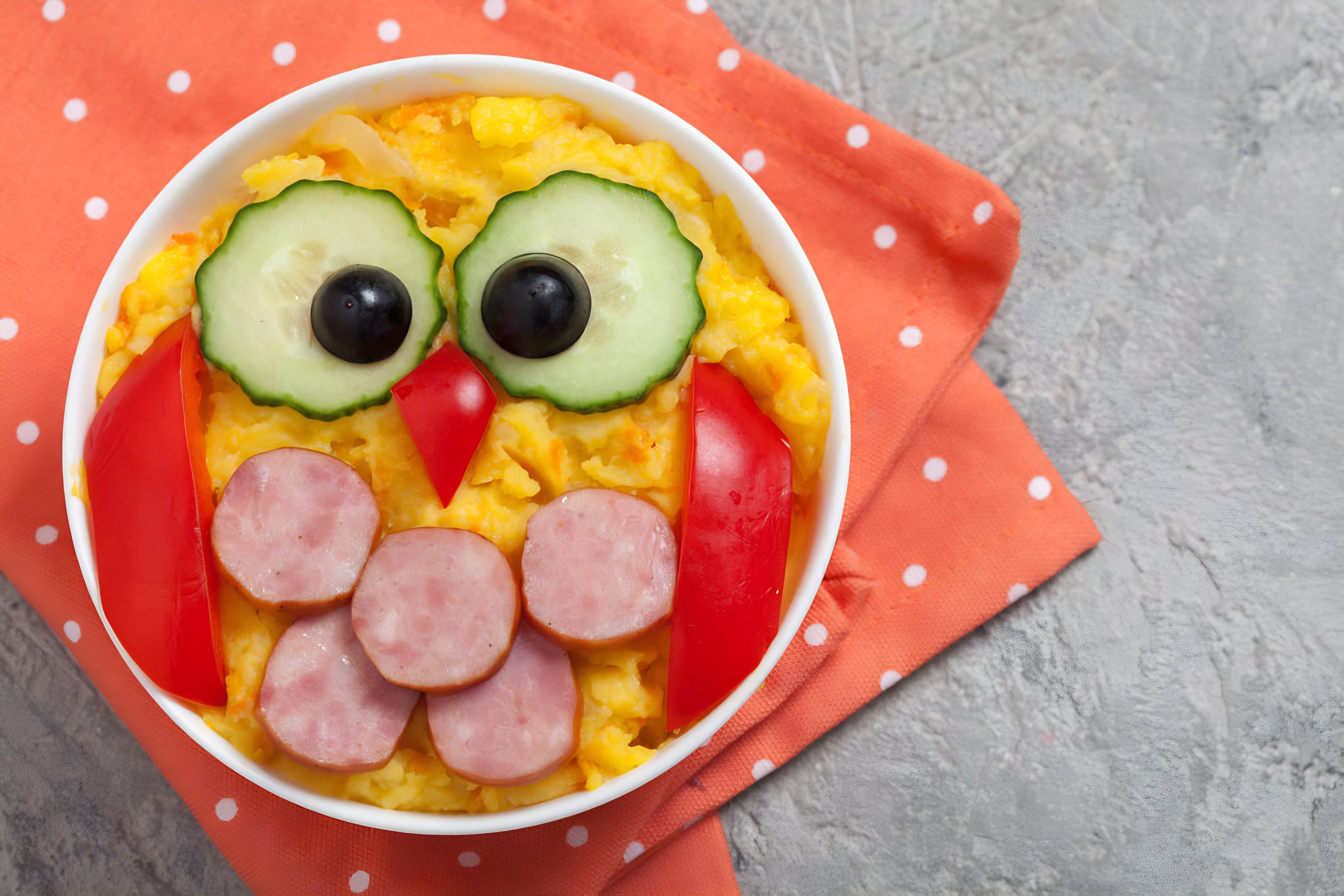 Funny owl mashed potato vegetable puree with sausage for kids lunch