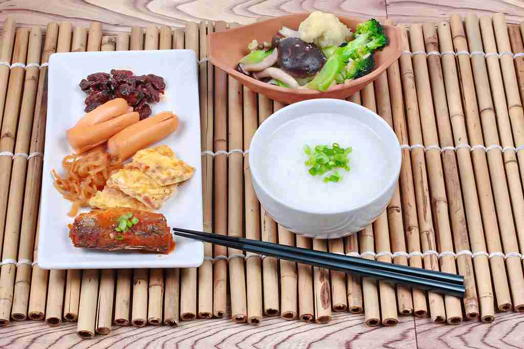 Rice gruel with sausage,clams,radish ,omelet and fried vegetable