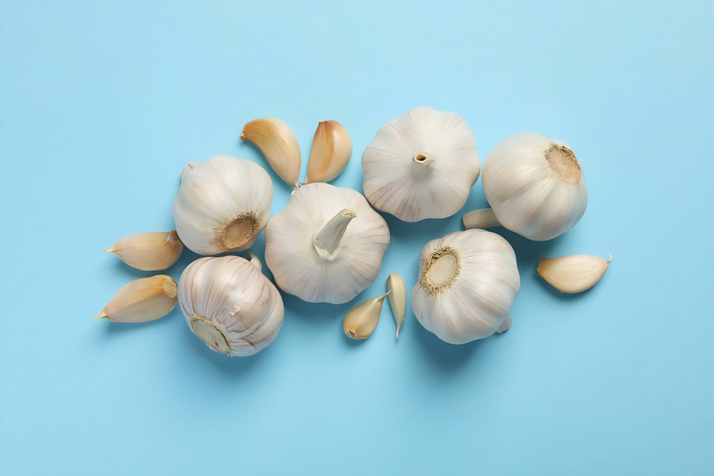 Fresh garlic bulbs, slices on blue background, top view. Space f