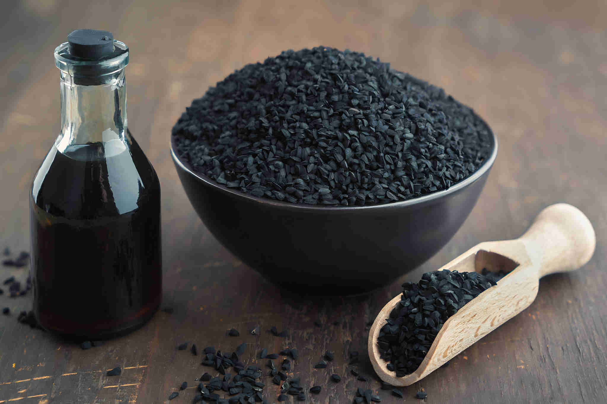 Black cumin or roman coriander seeds and black caraway oil bottle. Ingredients for cooking. Ayurveda