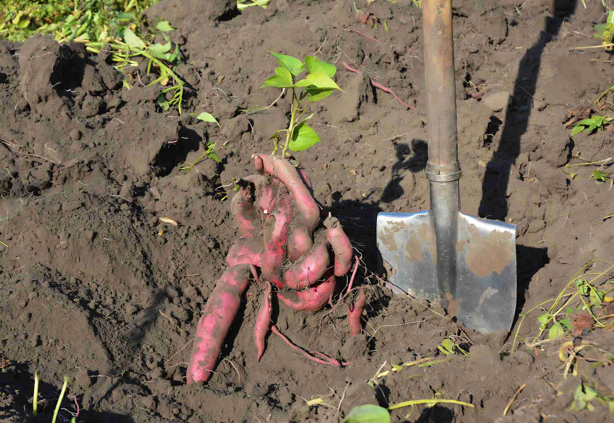 红薯或库马拉 (Ipomoea batatas) 收获。用铲子收割甘薯。种植红薯。