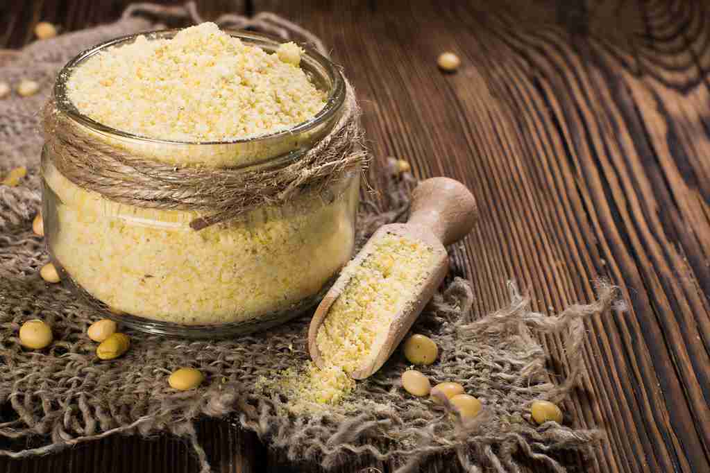 Soy flour on a wooden background. rustic style
