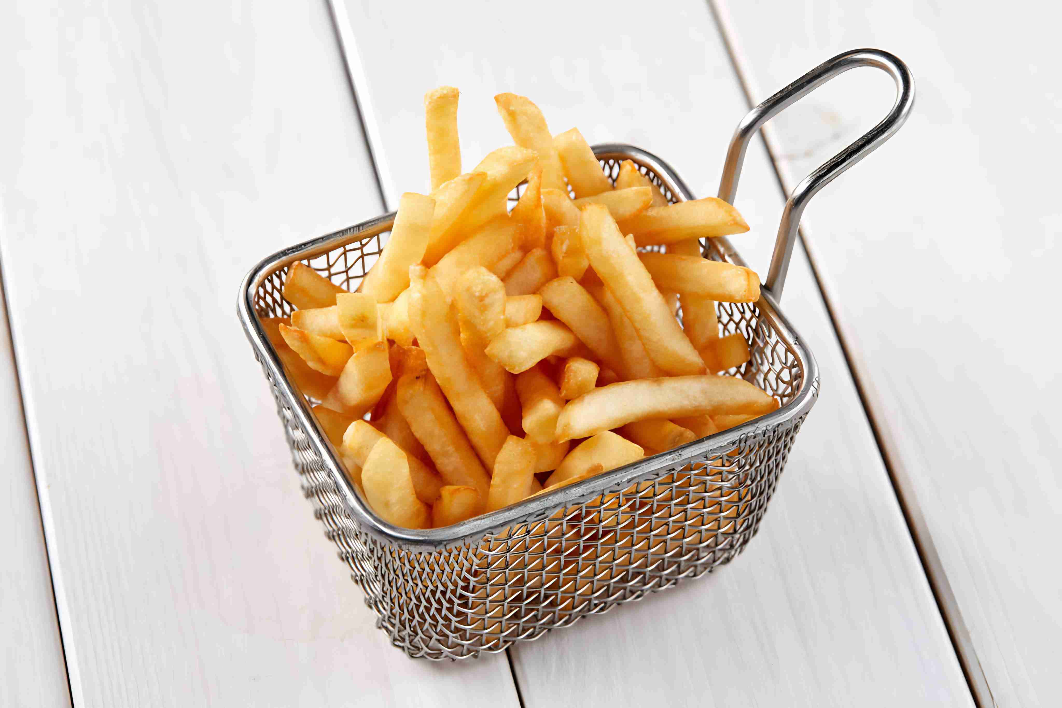 fried french fries in cooked basket, close view