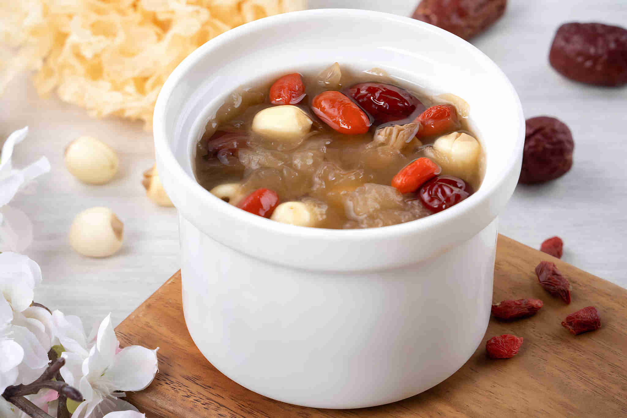 Close up of traditional Chinese sweet snow white fungus soup with lotus seed, red dates (jujube) and