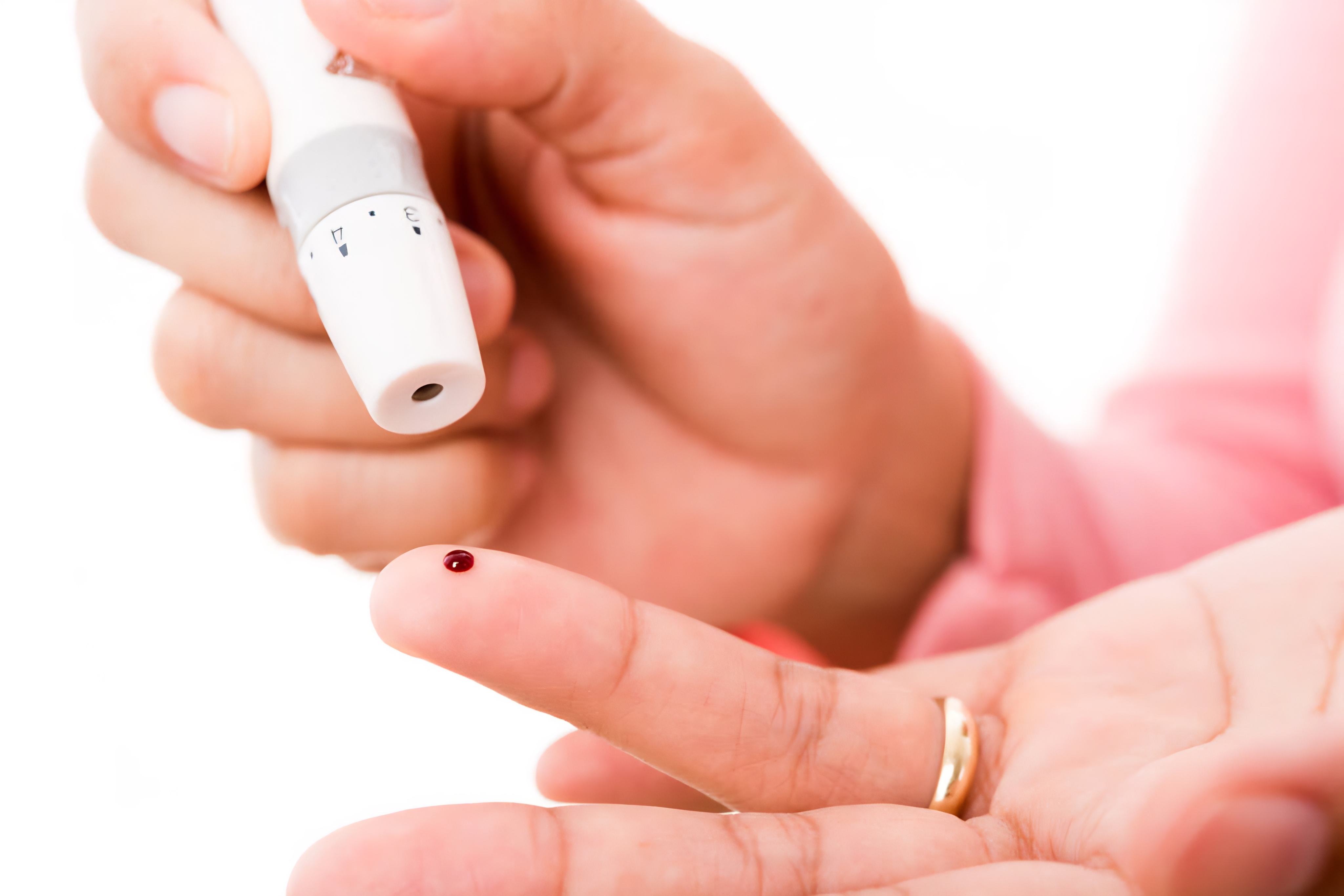 Closeup woman measuring glucose level using a hand test lancelet on the finger she monitors high blood sugar diabetes and glycemic health care concept