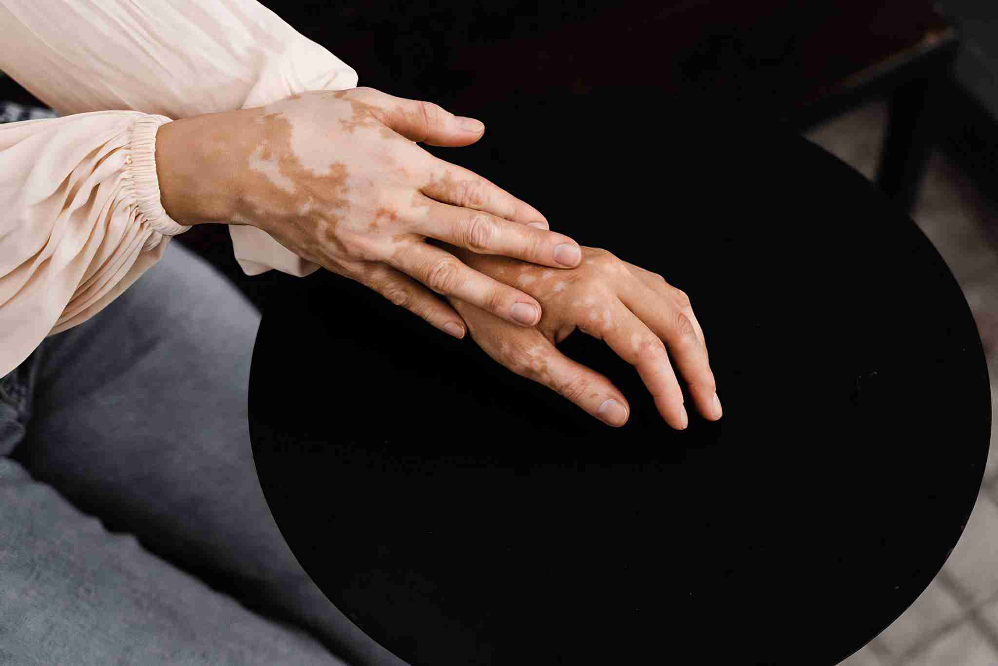 Hands with vitiligo skin pigmentation on black background close-up. Lifestyle with Seasonal skin dis
