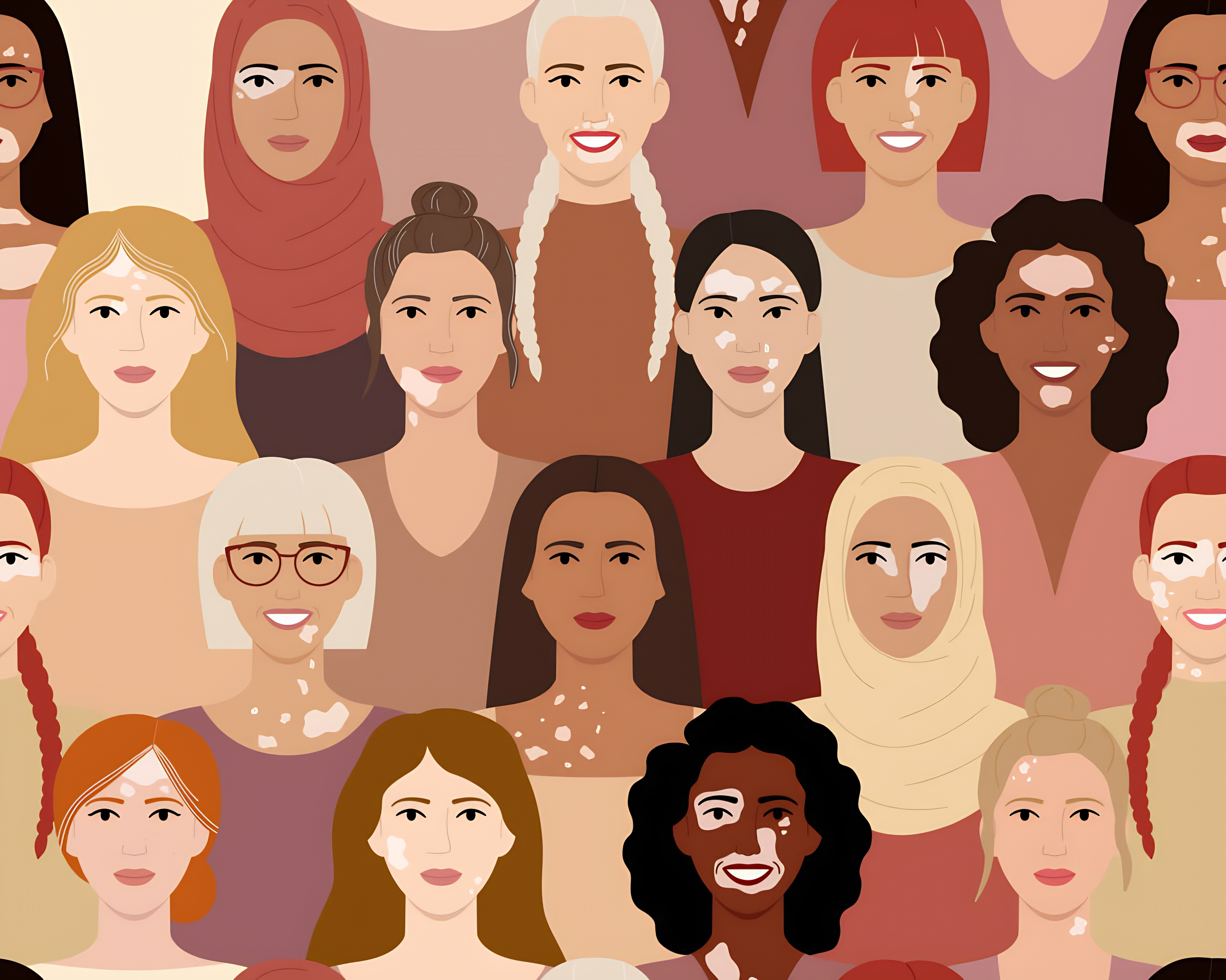 Seamless pattern of female faces with vitiligo. Portraits with different ethnics, skin colors, hairs