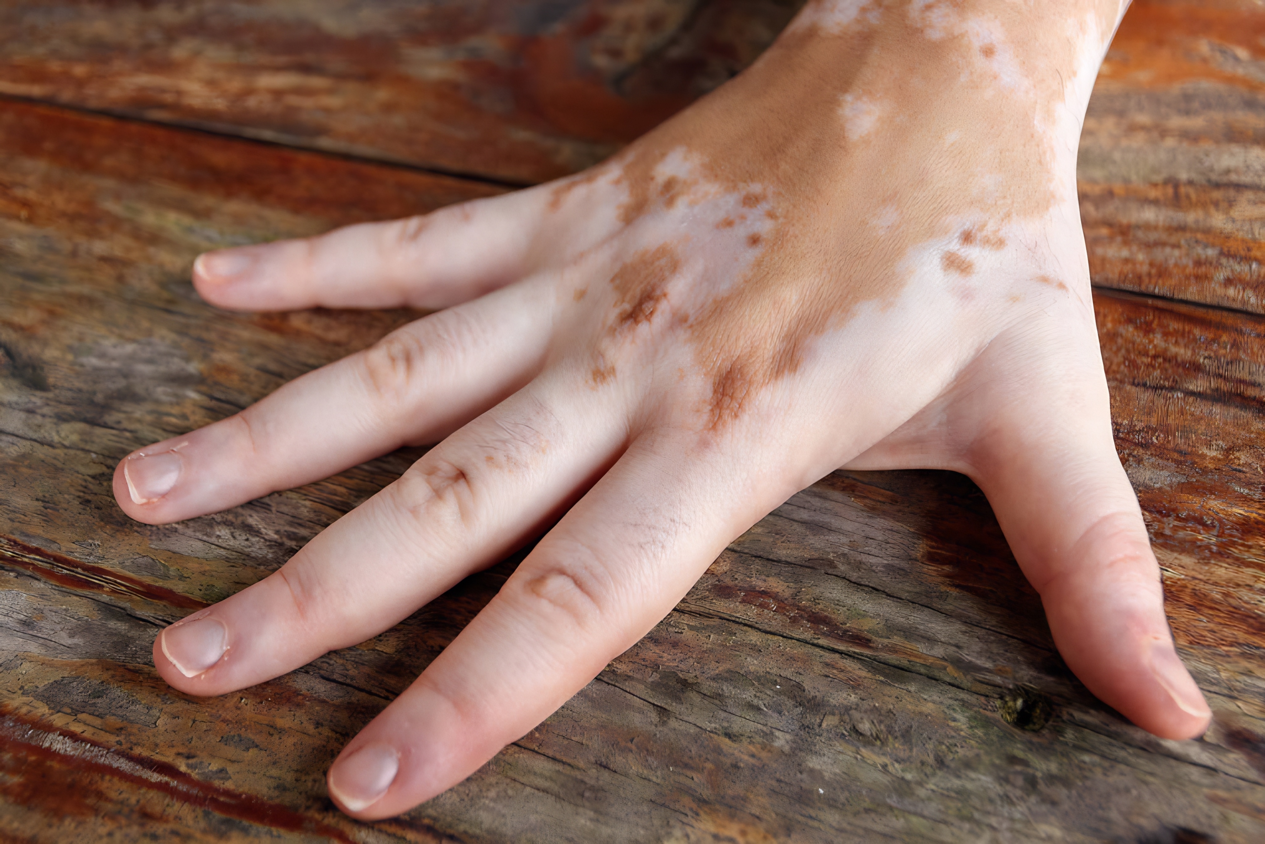 Close up of male hands with vitiligo pigments isolated on blue studio background