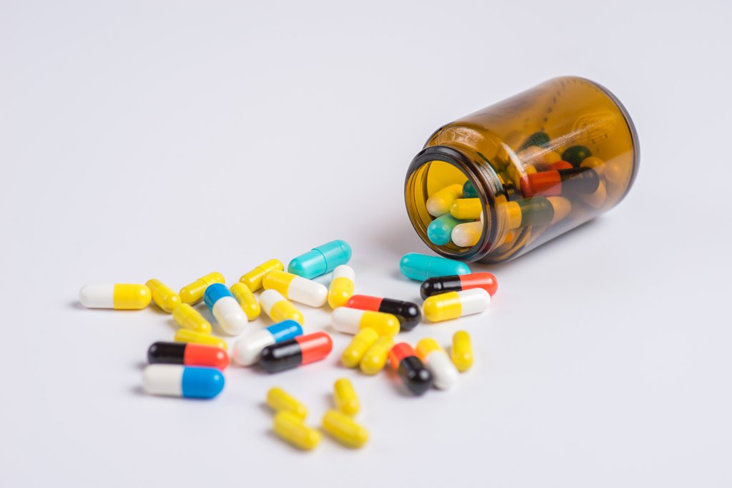 Assorted pills, tablets in the glass bottle on a white background