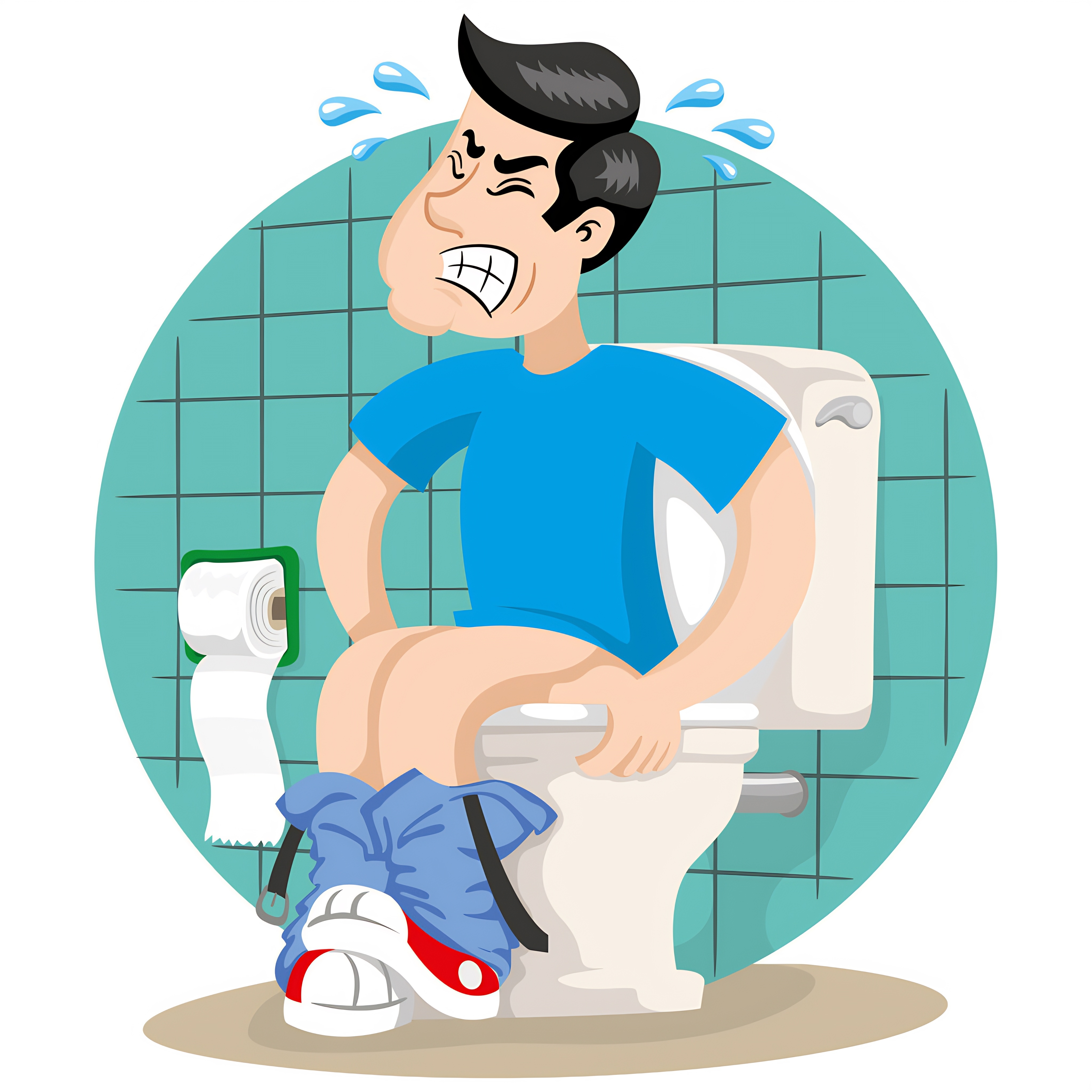 Mascot person man with diarrhea or stomach pain, symptom. Ideal for informational and institutional