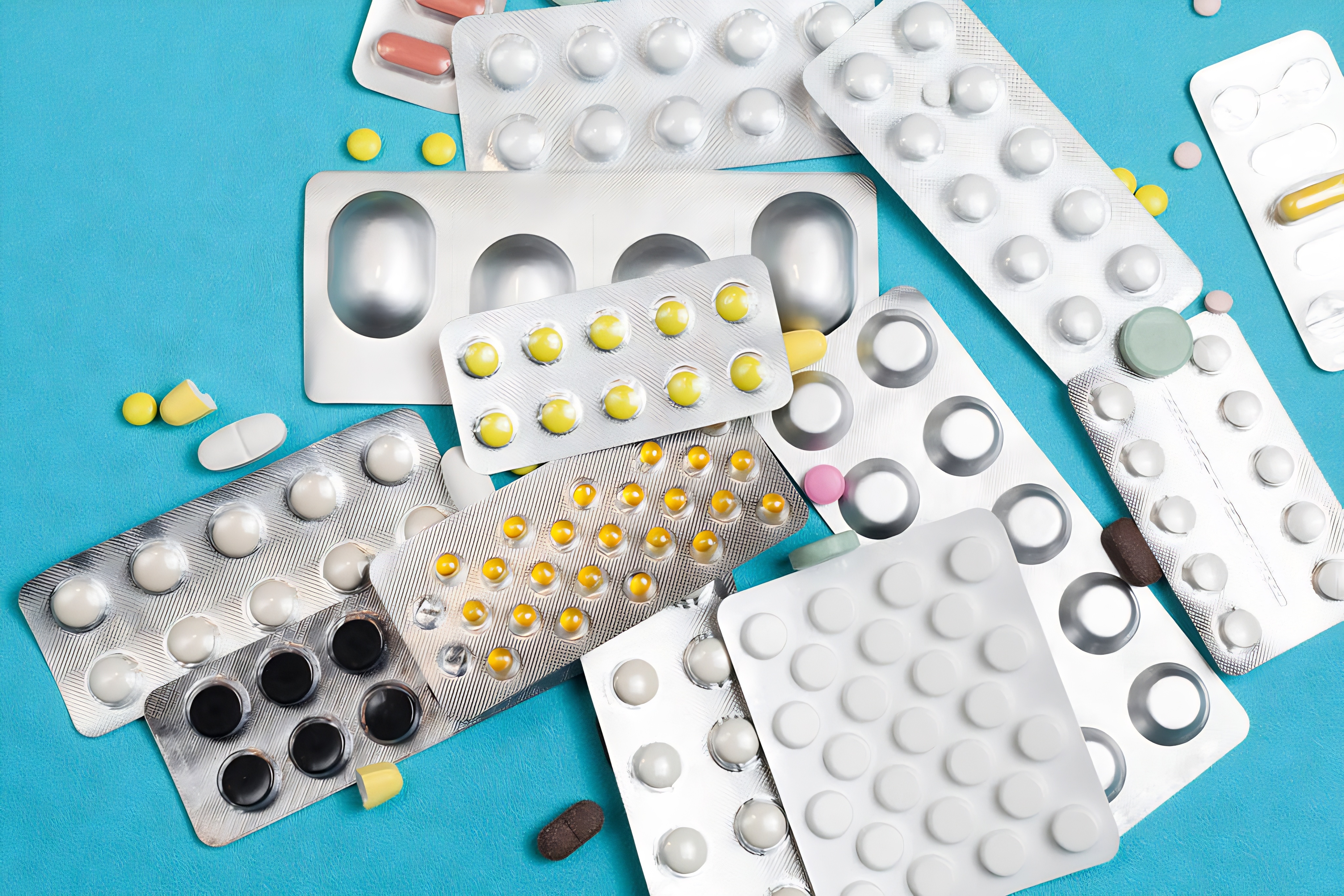 Selection of different pills in form of tablets on a blue background. Drug prescription for treatmen