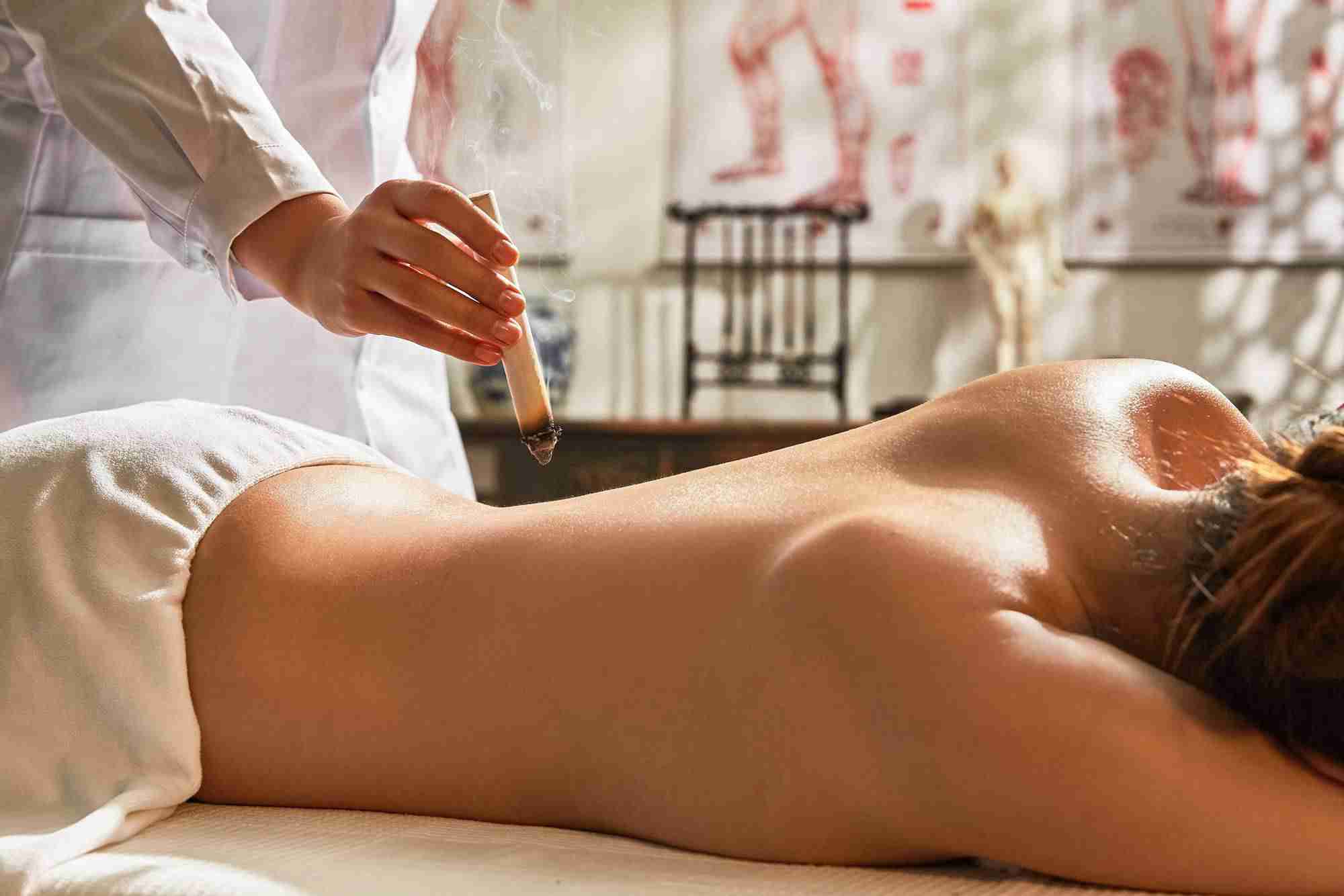 Auriculotherapy, or auricular treatment on human ear with flexible massage brass ear pen, close up.