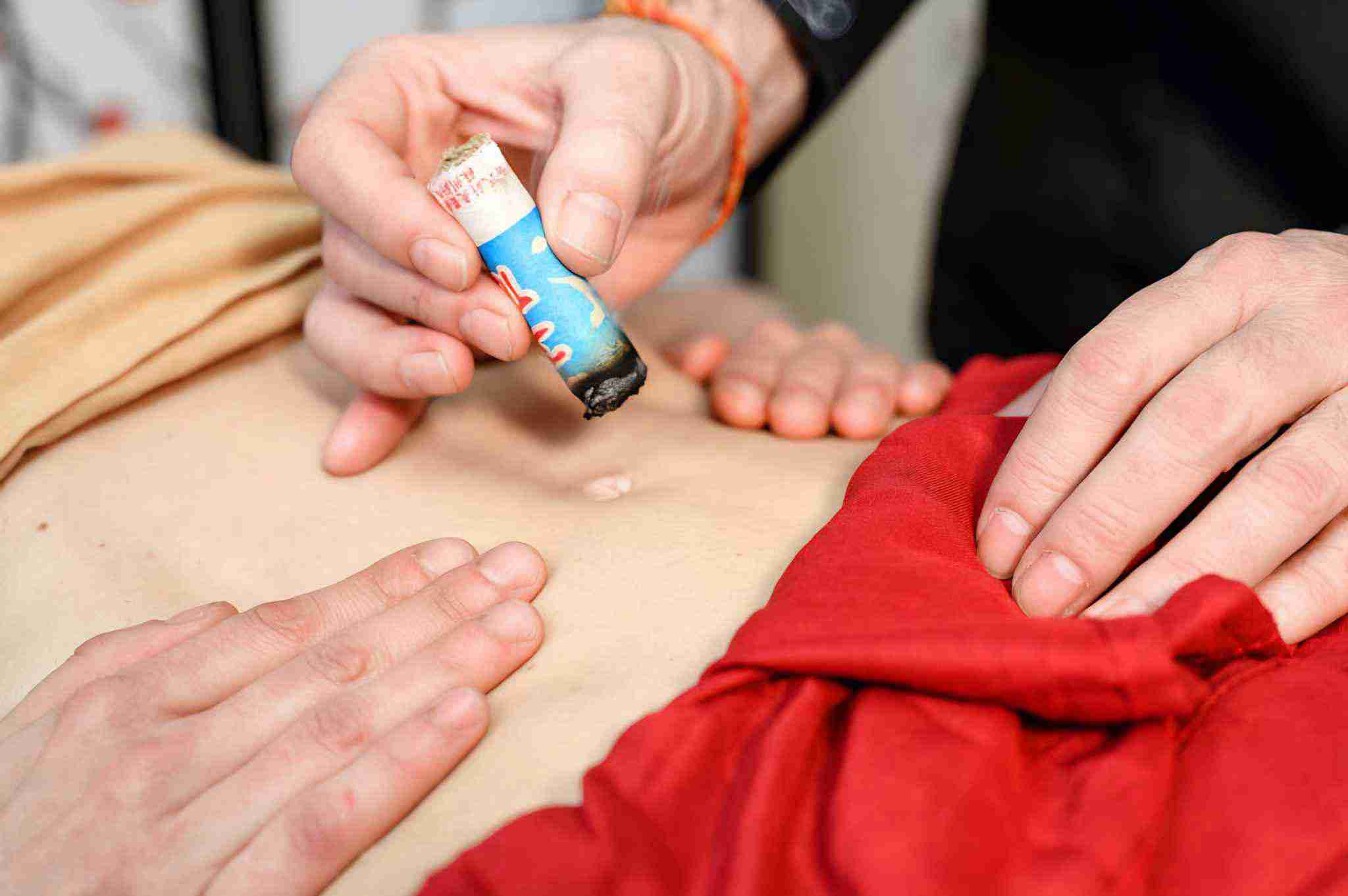 Alternative therapist applying moxibustion a traditional chinese medicine method.