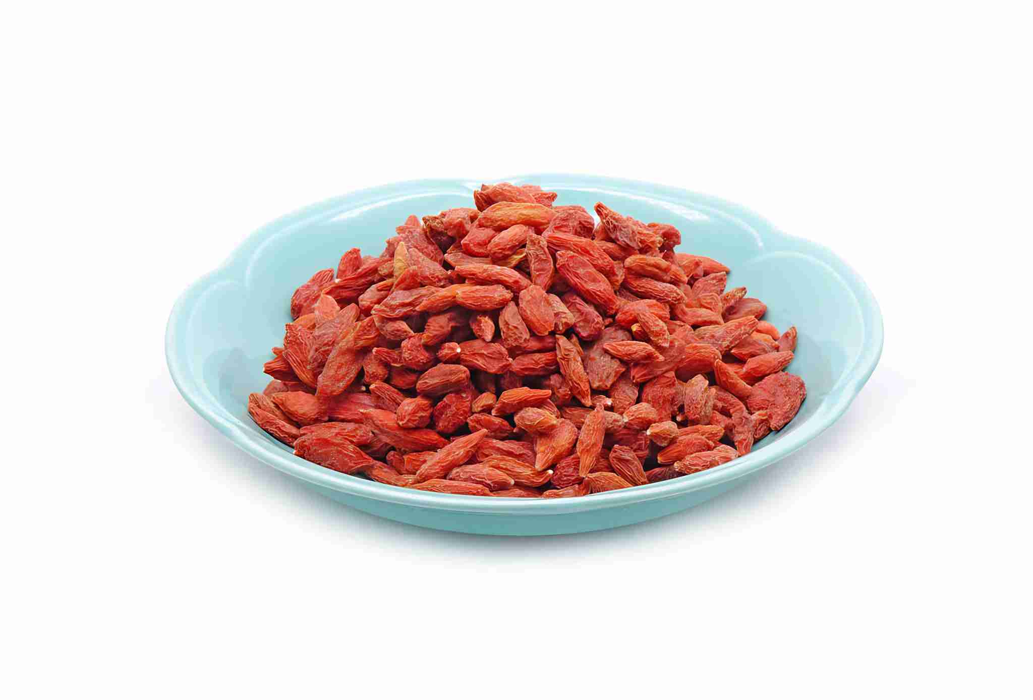 Goji berry in Chinese ceramic dish isolated on white background. Goji berry, or wolfberry. Used in t